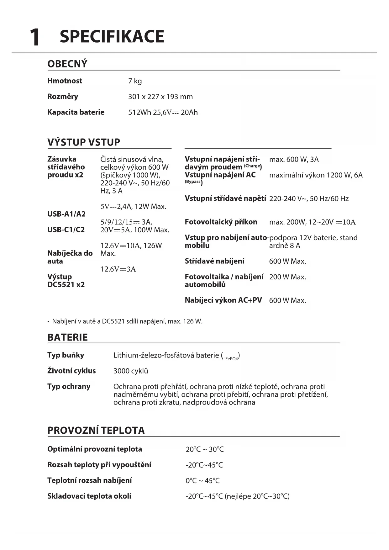 3000 cyklů Ochrana proti přehřátí, ochrana proti nízké teplotě, ochrana proti nadměrnému vybití, ochrana proti přebití, ochrana proti přetížení, ochrana proti zkratu, nadproudová ochrana 20°C ~ 30°C -20°C~45°C 0°C ~ 45°C -20°C~45°C (nejlépe 20°C~30°C) max. 600 W, 3A maximální výkon 1200 W, 6A 220-240 V~, 50 Hz/60 Hz max. 200W, 12~20V ⎓10A podpora 12V baterie, stand- ardně 8 A 600 W Max. 200 W Max. 600 W Max.