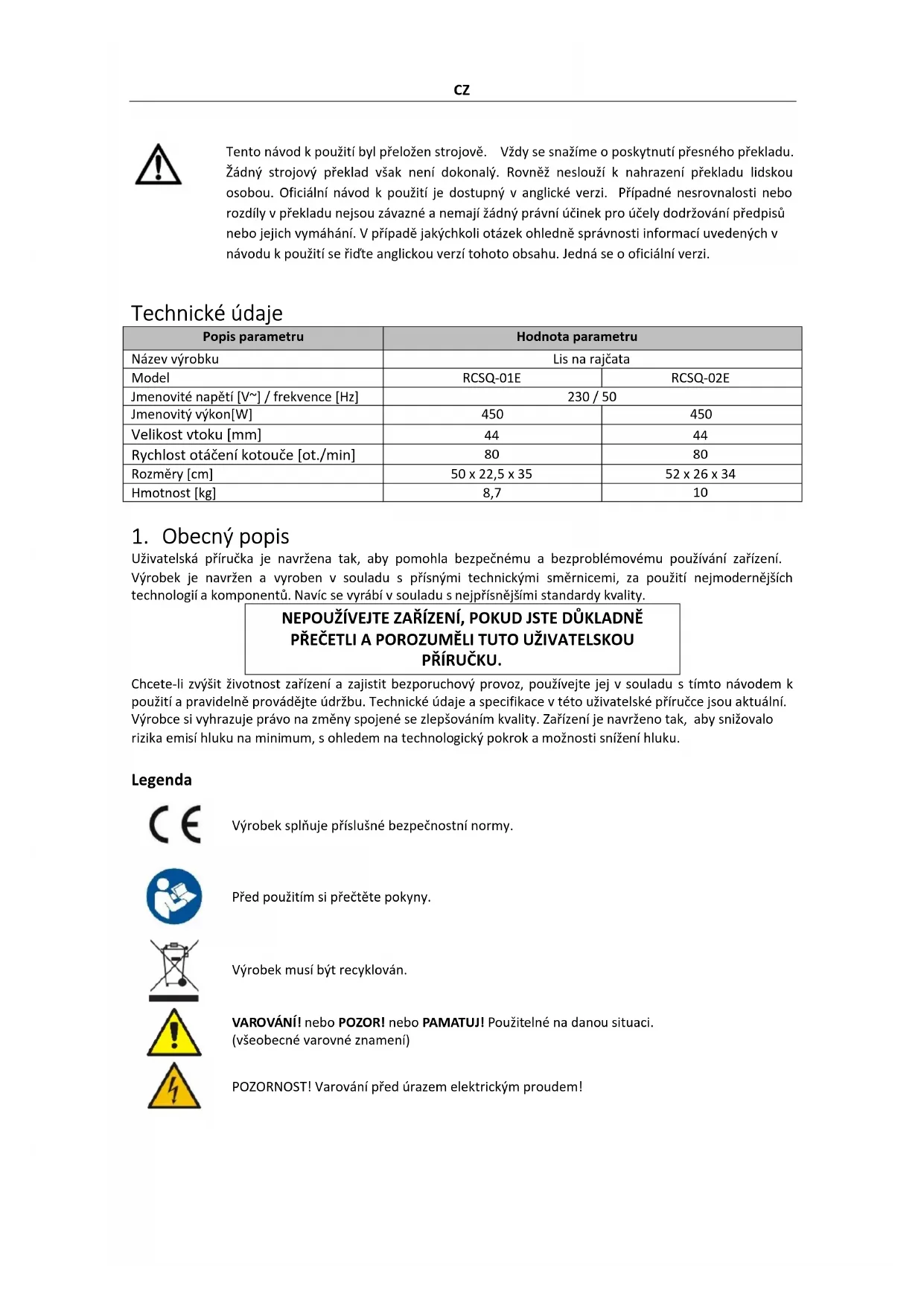POZORNOST! I přes bezpečnou konstrukci zařízení a jeho ochranné vlastnosti a přes použití přídavných prvků chránících obsluhu stále existuje mírné riziko nehody nebo zranění při používání zařízení. Při používání zařízení buďte ve střehu a používejte zdravý rozum.