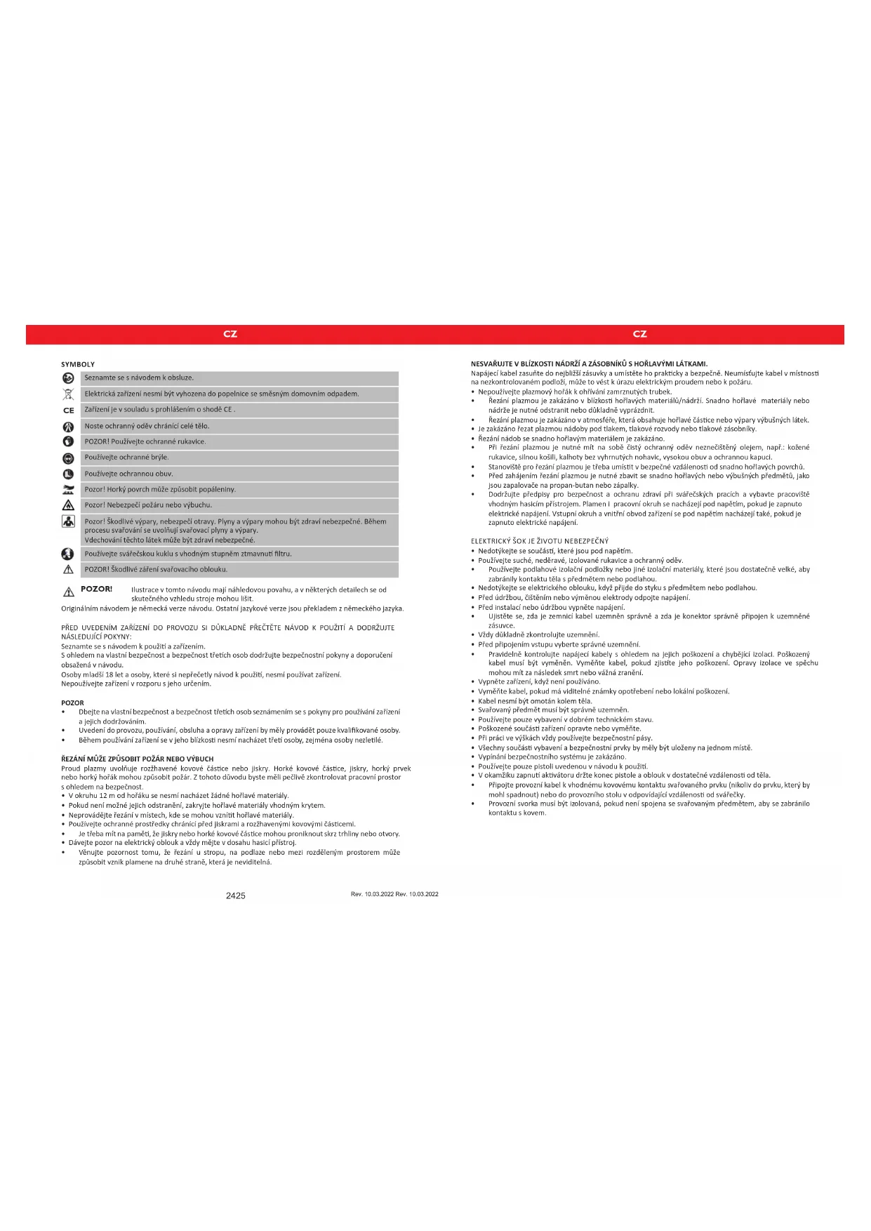 - Provozní svorka musí být izolovaná, pokud není spojena se svařovaným předmětem, aby se zabránilo kontaktu s kovem. CZ26 27 Rev. 10.03.2022 Rev. 10.03.2022