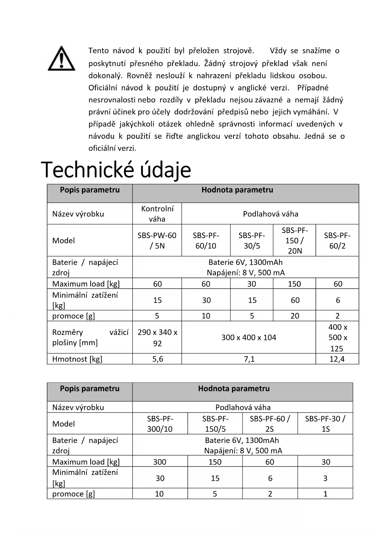 j) Nepoužívejte ostré a/nebo kovové předměty (např. drátěný kartáč nebo kovovou špachtli), protože mohou poškodit povrch materiálu, ze kterého je zařízení vyrobeno. k) Nečistěte výrobek kyselými látkami, lékařskými prostředky, ředidly, palivem, oleji nebo jinými chemikáliemi. Mohlo by dojít k poškození zařízení.POKYNY PRO BEZPEČNOU LIKVIDACI BATERIE: Zařízení jsou vybavena bateriemi 6 V, 1300 mAh. Vyčerpaný akumulátor demontujte ze zařízení obdobným postupem jako při jeho montáži. Opotřebené baterie odevzdejte v místě zodpovědném za likvidaci těchto materiálů. LIKVIDACE OPOTŘEBOVANÝCH ZAŘÍZENÍ. Po skončení životnosti toto zařízení nelikvidujte s normálním komunálním odpadem, ale odevzdejte ho do sběrného dvora za účelem recyklace elektrických a elektronických zařízení. Informuje o tom symbol umístěný na výrobku, v návodu k obsluze nebo na obalu. Plasty použité v zařízení jsou vhodné pro opakované použití v souladu s jejich označením. Díky opakovanému použití, využití materiálů nebo jiným formám využívání opotřebovaných zařízení přispíváte k ochraně našeho životního prostředí. Informace o příslušném sběrném dvoře pro likvidaci vyřazených zařízení Vám poskytne orgán místní samosprávy.Ce manuel d’utilisation a été traduit à l’aide d’une traduction automatique pour votre confort. Des efforts raisonnables ont été faits pour vous fournir une traduction précise ; cependant, aucune traduction automatique n’est parfaite et ne pourra jamais remplacer les traducteurs humains. La version anglaise est la version officielle de nos manuels d’utilisation. Toute divergence ou différence créée par la traduction n'est pas contraignante et n'a aucun effet juridique à des fins de conformité ou d' application. En cas de questions relatives à l'exactitude des informations contenues dans le manuel d'utilisation, veuillez-vous référer à la version anglaise de ces contenus en tant que version officielle. Caractéristiques techniques Description du paramètre Valeur du paramètre Nom de produit Balance de contrôle Balance plateforme Modèle SBS-PW-60 / 5N SBS-PF- 60/10 SBS-PF- 30/5 SBS-PF- 150 / 20N SBS-PF- 60/2 Batterie / alimentation Batterie 6V, 1300mAh Alimentation : 8 V, 500 mA Maximum load [kg]
