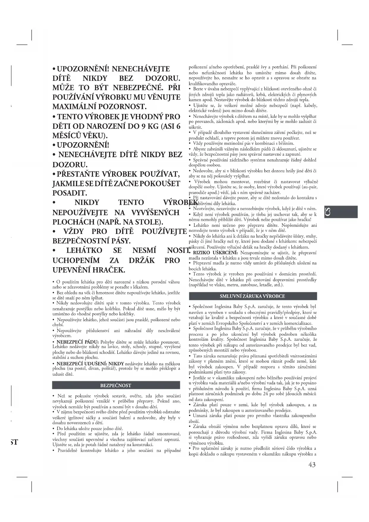 - Jestliže se v okamžiku zakoupení nebo běžného používání projeví u výrobku vada materiálů a/nebo výrobní vada tak, jak je to popsáno v příslušném návodu k použití, firma Inglesina Baby S.p.A. uzná platnost záručních podmínek po dobu 24 po sobě jdoucích měsíců od data zakoupení.