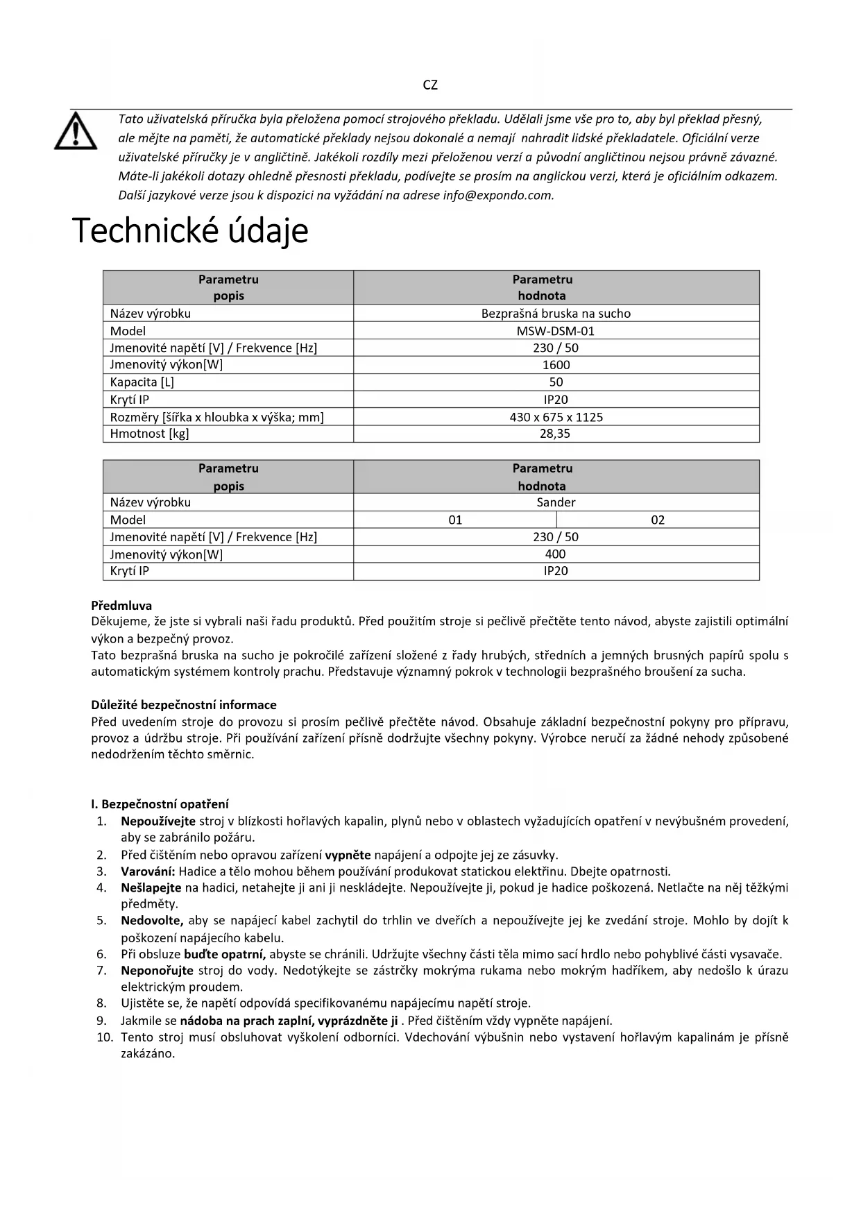 Tato uživatelská příručka byla přeložena pomocí strojového překladu. Udělali jsme vše pro to, aby byl překlad přesný, ale mějte na paměti, že automatické překlady nejsou dokonalé a nemají nahradit lidské překladatele. Oficiální verze uživatelské příručky je v angličtině. Jakékoli rozdíly mezi přeloženou verzí a původní angličtinou nejsou právně závazné. Máte-li jakékoli dotazy ohledně přesnosti překladu, podívejte se prosím na anglickou verzi, která je oficiálním odkazem. Další jazykové verze jsou k dispozici na vyžádání na adrese info@expondo.com. Technické údaje Parametru popis Parametru hodnota Název výrobku Bezprašná bruska na sucho Model MSW-DSM-01 Jmenovité napětí [V] / Frekvence [Hz] 230 / 50 Jmenovitý výkon[W]