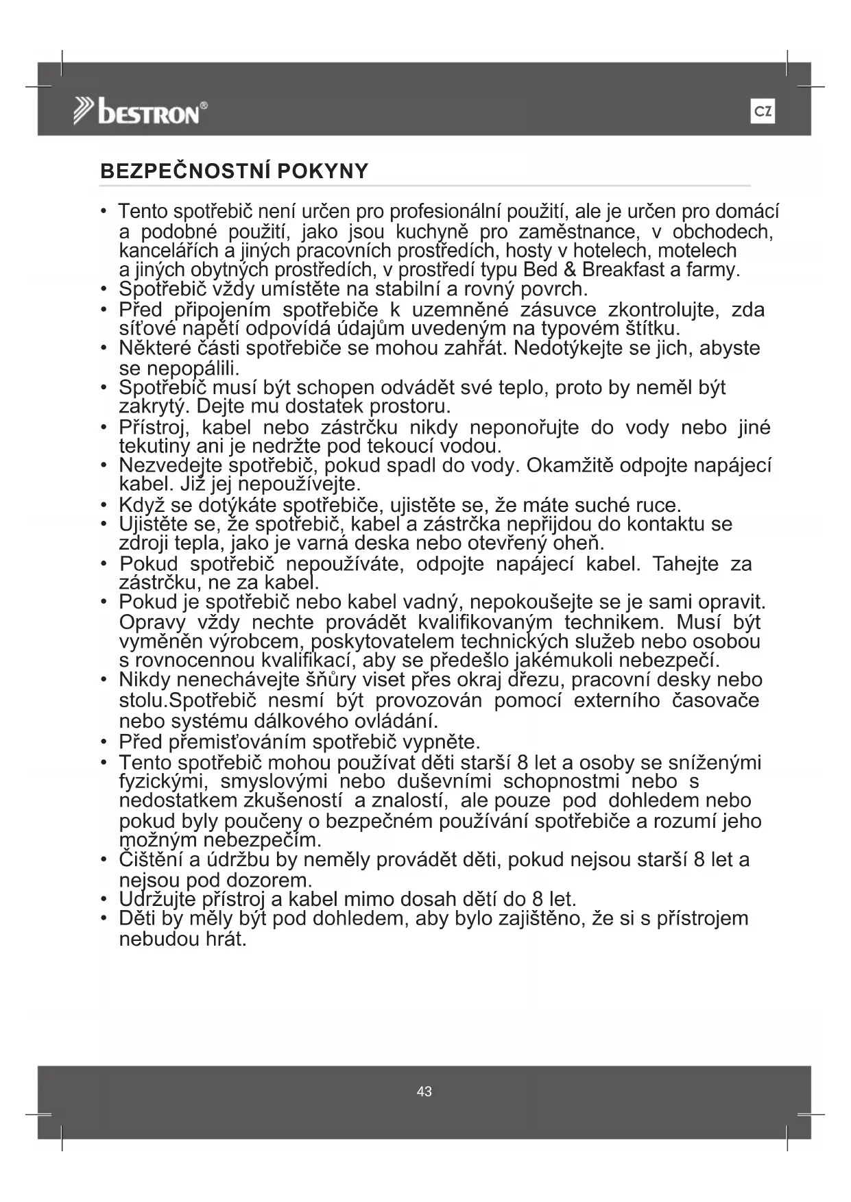 - Pokud je spotřebič nebo kabel vadný, nepokoušejte se je sami opravit. Opravy vždy nechte provádět kvalikovaným technikem. Musí být vyměněn výrobcem, poskytovatelem technických služeb nebo osobou s rovnocennou kvalikací, aby se předešlo jakémukoli nebezpečí.