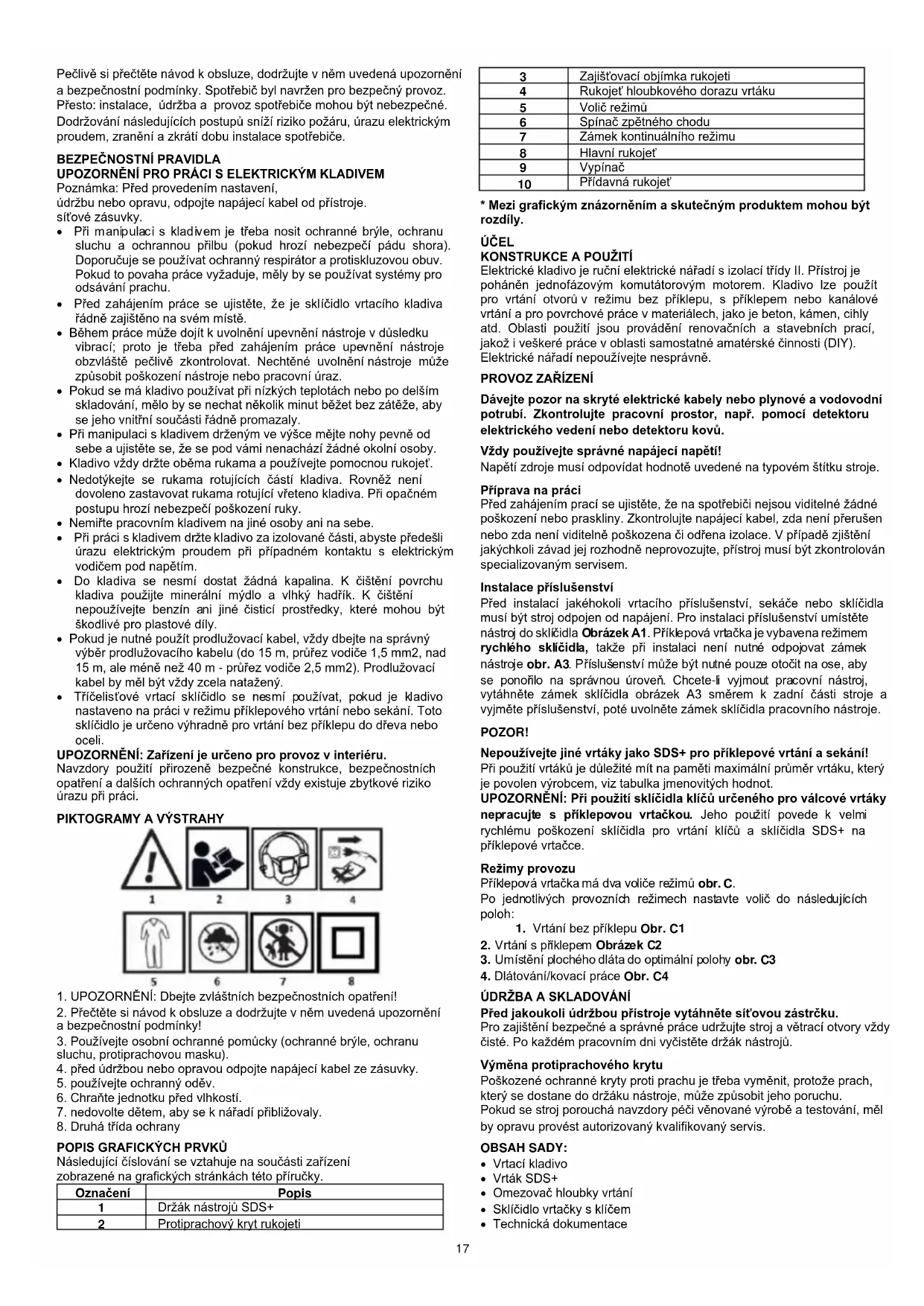 - Tříčelisťové vrtací sklíčidlo se nesmí používat, pokud je kladivo nastaveno na práci v režimu příklepového vrtání nebo sekání. Toto sklíčidlo je určeno výhradně pro vrtání bez příklepu do dřeva nebo oceli. UPOZORNĚNÍ: Zařízení je určeno pro provoz v interiéru. Navzdory použití přirozeně bezpečné konstrukce, bezpečnostních opatření a dalších ochranných opatření vždy existuje zbytkové riziko úrazu při práci.