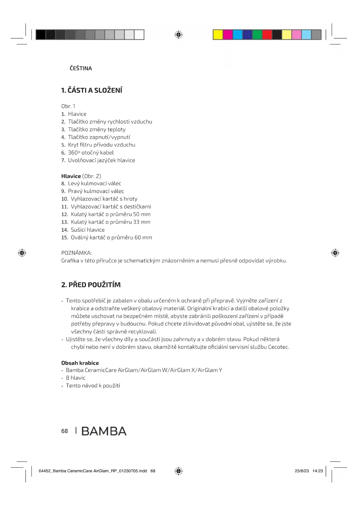 - Tento spotřebič je zabalen v obalu určeném k ochraně při přepravě. Vyjměte zařízení z krabice a odstraňte veškerý obalový materiál. Originální krabici a další obalové položky můžete uschovat na bezpečném místě, abyste zabránili poškození zařízení v případě potřeby přepravy v budoucnu. Pokud chcete zlikvidovat původní obal, ujistěte se, že jste všechny části správně recyklovali. - Ujistěte se, že všechny díly a součásti jsou zahrnuty a v dobrém stavu. Pokud některá chybí nebo není v dobrém stavu, okamžitě kontaktujte ociální servisní službu Cecotec. Obsah krabice - Bamba CeramicCare AirGlam/AirGlam W/AirGlam X/AirGlam Y - 8 hlavic - Tento návod k použití 04452_Bamba CeramicCare AirGlam_RP_01230705.indd 6804452_Bamba CeramicCare AirGlam_RP_01230705.indd 68 23/8/23 14:2323/8/23 14:23Bamba CeramicCare AirGlam