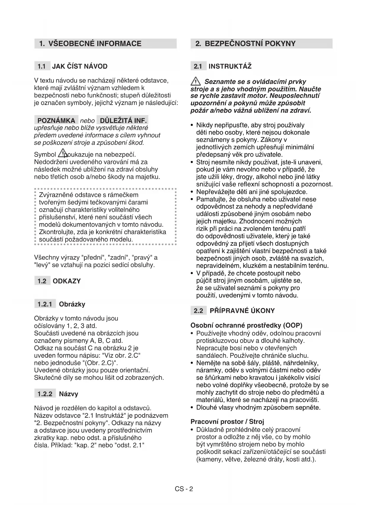 V textu návodu se nacházejí některé odstavce, které mají zvláštní význam vzhledem k bezpečnosti nebo funkčnosti; stupeň důležitosti je označen symboly, jejichž význam je následující: POZNÁMKA nebo DŮLEŽITÁ INF. upřesňuje nebo blíže vysvětluje některé předem uvedené informace s cílem vyhnout se poškození stroje a způsobení škod. Symbol poukazuje na nebezpečí. Nedodržení uvedeného varování má za následek možné ublížení na zdraví obsluhy nebo třetích osob a/nebo škody na majetku. Zvýrazněné odstavce s rámečkem tvořeným šedými tečkovanými čarami označují charakteristiky volitelného příslušenství, které není součástí všech modelů dokumentovaných v tomto návodu. Zkontrolujte, zda je konkrétní charakteristika součástí požadovaného modelu. Všechny výrazy "přední", "zadní", "pravý" a "levý" se vztahují na pozici sedící obsluhy.
