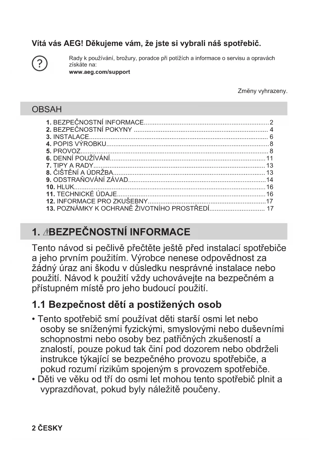 Recyklujte materiály označené symbolem . Obaly vyhoďte do příslušných odpadních kontejnerů k recyklaci. Pomáhejte chránit životní prostředí a lidské zdraví a recyklovat elektrické a elektronické spotřebiče určené k likvidaci. Spotřebiče označené příslušným symbolem nelikvidujte spolu s domovním odpadem. Spotřebič odevzdejte v místním sběrném dvoře nebo kontaktujte místní úřad. ČESKY 17Velkommen til AEG! Tak, fordi du valgte vores produkt. Få råd om brug, brochurer, fejlfinding, service- og reparationsinformation:www.aeg.com/supportRet til ændringer uden varsel forbeholdes. INDHOLDSFORTEGNELSE