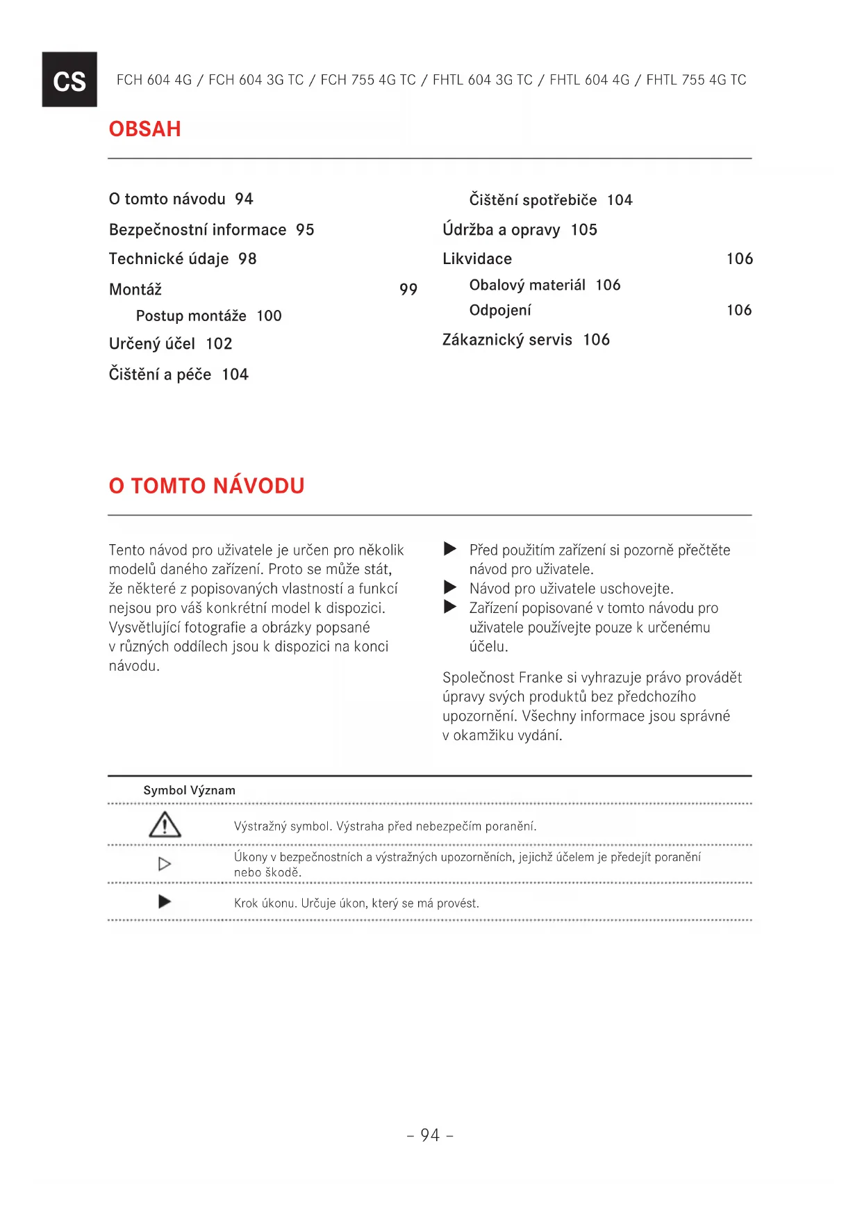 Zařízení popisované vtomto návodu pro uživatele používejte pouze kurčenému účelu. Společnost Franke si vyhrazuje právo provádět úpravy svých produktů bez předchozího upozornění. Všechny informace jsou správné vokamžiku vydání. OBSAH Otomto návodu 94 Bezpečnostní informace 95 Technické údaje 98 Montáž 99 Postup montáže 100 Určený účel 102 Čištění apéče 104 Čištění spotřebiče 104 Údržba a opravy 105 Likvidace 106 Obalový materiál 106 Odpojení 106 Zákaznický servis 106– 95 – FCH 604 4G / FCH 604 3G TC / FCH 755 4G TC / FHTL 604 3G TC / FHTL 604 4G / FHTL 755 4G TC