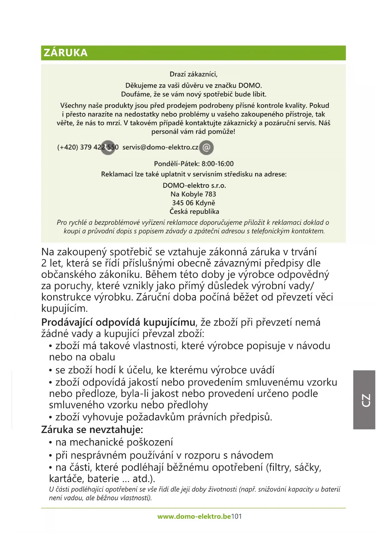 - na části, které podléhají běžnému opotřebení (ltry, sáčky, kartáče, baterie … atd.). U části podléhající opotřebení se vše řídí dle její doby životnosti (např. snižování kapacity u baterií není vadou, ale běžnou vlastností).102 www.domo-elektro.be