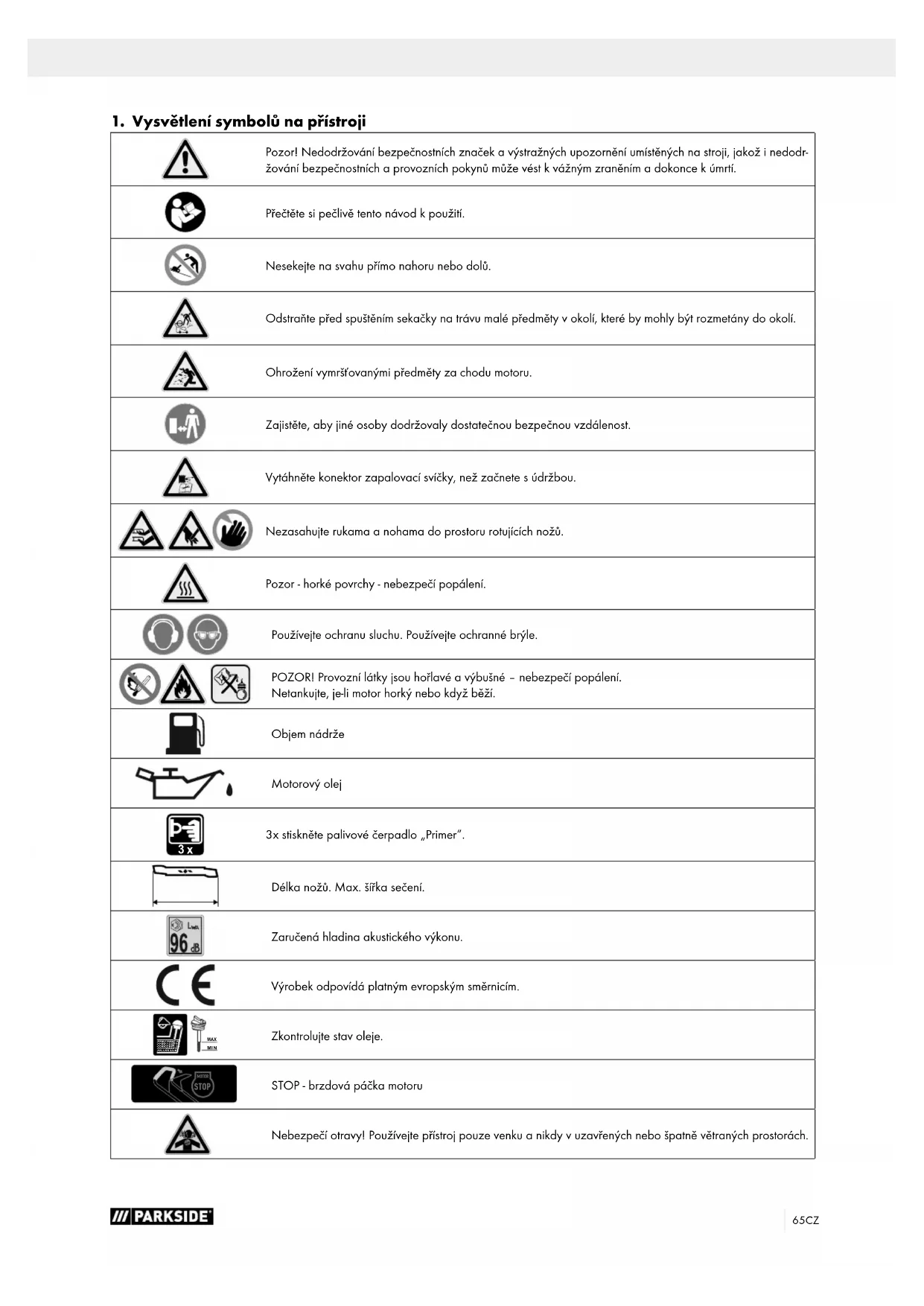 3x stiskněte palivové čerpadlo „Primer“. Délka nožů. Max. šířka sečení. Zaručená hladina akustického výkonu. Výrobek odpovídá platným evropským směrnicím. MIN MAX Zkontrolujte stav oleje. STOP MOTOR STOP - brzdová páčka motoru Nebezpečí otravy! Používejte přístroj pouze venku a nikdy v uzavřených nebo špatně větraných prostorách.66 CZ m Pozor! Místa, která se týkají bezpečnosti, jsme v návodu k použití označili touto značkou. NEBEZPEČÍ! Signální slovo označující bezprostředně nastávající nebezpečnou situaci, která může mít za následek smrt nebo vážné zranění, pokud se jí nezabrání. VAROVÁNÍ! Signální slovo označující potenciálně nebezpečnou situaci, která by mohla mít za následek smrt nebo vážné zranění, pokud se jí nezabrání. OPATRNĚ! Signální slovo označující potenciálně nebezpečnou situaci, která by mohla mít za následek lehké nebo středně těžké zranění, pokud se jí nezabrání. UPOZORNĚNÍ Signální slovo označující potenciálně nebezpečnou situaci, která by mohla mít za následek poškození výrobku nebo vlastnictví/majetku.67CZ