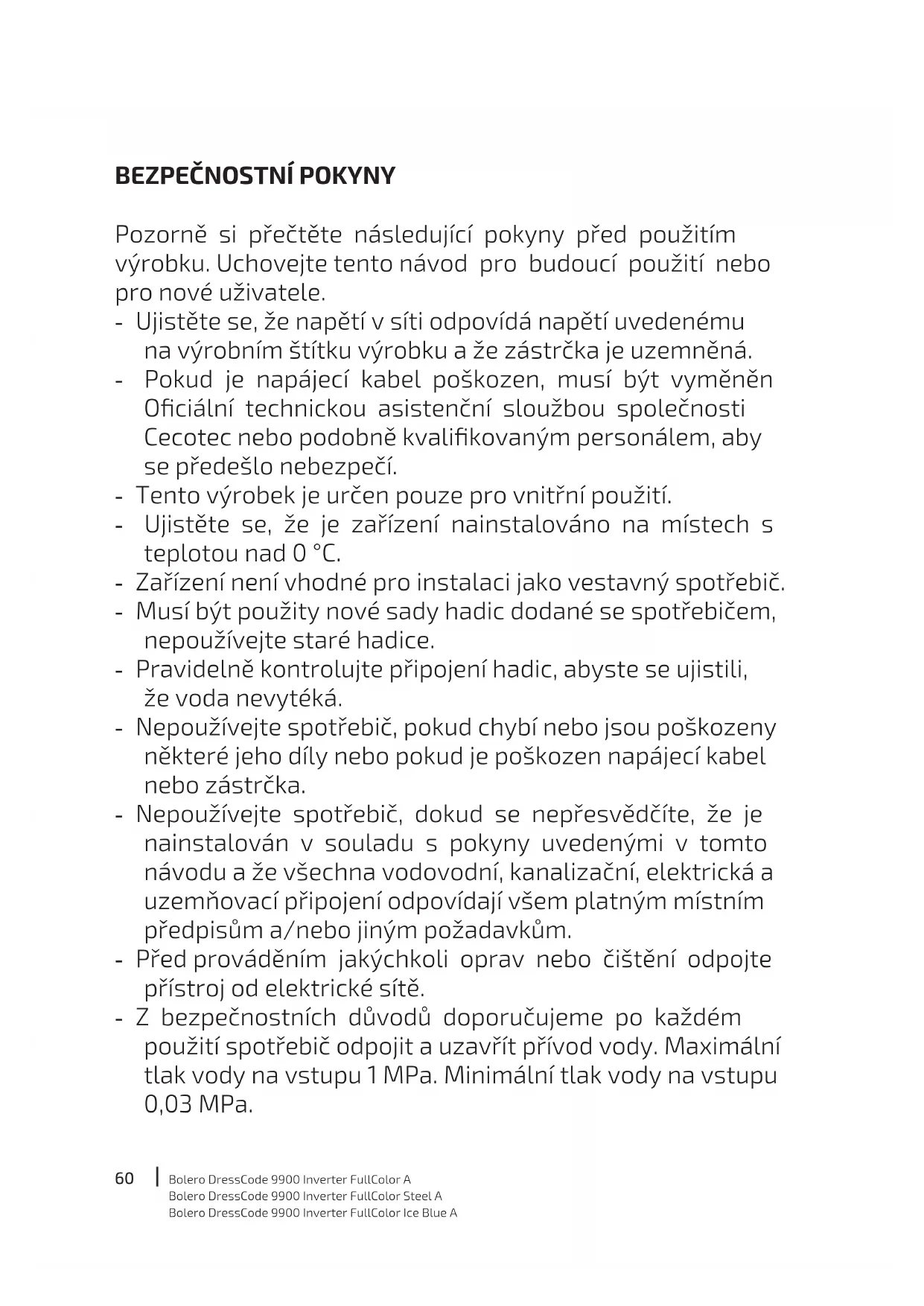 Pozorně si přečtěte následující pokyny před použitím výrobku. Uchovejte tento návod pro budoucí použití nebo pro nové uživatele. - Ujistěte se, že napětí v síti odpovídá napětí uvedenému na výrobním štítku výrobku a že zástrčka je uzemněná. - Pokud je napájecí kabel poškozen, musí být vyměněn Ociální technickou asistenční sloužbou společnosti Cecotec nebo podobně kvalikovaným personálem, aby se předešlo nebezpečí. - Tento výrobek je určen pouze pro vnitřní použití. - Ujistěte se, že je zařízení nainstalováno na místech s teplotou nad 0 °C. - Zařízení není vhodné pro instalaci jako vestavný spotřebič. - Musí být použity nové sady hadic dodané se spotřebičem, nepoužívejte staré hadice. - Pravidelně kontrolujte připojení hadic, abyste se ujistili, že voda nevytéká. - Nepoužívejte spotřebič, pokud chybí nebo jsou poškozeny některé jeho díly nebo pokud je poškozen napájecí kabel nebo zástrčka. - Nepoužívejte spotřebič, dokud se nepřesvědčíte, že je nainstalován v souladu s pokyny uvedenými v tomto návodu a že všechna vodovodní, kanalizační, elektrická a uzemňovací připojení odpovídají všem platným místním předpisům a/nebo jiným požadavkům. - Před prováděním jakýchkoli oprav nebo čištění odpojte přístroj od elektrické sítě. - Z bezpečnostních důvodů doporučujeme po každém použití spotřebič odpojit a uzavřít přívod vody. Maximální tlak vody na vstupu 1 MPa. Minimální tlak vody na vstupu 0,03 MPa.61 Bolero DressCode 9900 Inverter FullColor A Bolero DressCode 9900 Inverter FullColor Steel A Bolero DressCode 9900 Inverter FullColor Ice Blue A - Nevytahujte zástrčku mokrýma rukama. - Z bezpečnostních důvodů nezapomeňte připojit zástrčku do tříkolíkové zásuvky. Spotřebič musí být řádně uzemněn. - Musí být možné odpojit spotřebič od zdroje napájení vytažením zástrčky ze zásuvky, pokud je zástrčka přístupná, nebo pomocí jednopólového vypínače umístěného nad zástrčkou v souladu s vnitrostátními předpisy o elektrické bezpečnosti. - Maximální proud zařízení je 10 A, ujistěte se, že napájecí systém (napětí, proud a kabel) je použitelný pro napájení zařízení. - Ujistěte se, že zásuvka je vhodná pro maximální výkon spotřebiče, který je uveden na typovém štítku. - Elektrická a vodní zařízení musí být připojena kvalikovanými techniky v souladu s místními a národními bezpečnostními předpisy stanovenými výrobcem. - Je možné, že skleněné dvířka dosáhnou během provozu velmi vysokých teplot. Udržujte děti a domácí zvířata během provozu v dostatečné vzdálenosti od spotřebiče. Nikdy neotvírejte dvířka během fáze praní. - Nepoužívejte zařízení v místnostech, kde je voda, výbušniny nebo žíravé plyny. - V místnosti musí být zajištěno dobré větrání, aby nedocházelo k hromadění plynů vznikajících při spalování paliv z jiných spotřebičů, což by mohlo způsobit nebezpečí požáru. - Nesušte v spotřebiči prádlo, které jste dříve nevyprali. - Neperte oblečení se skvrnami od látek, jako jsou oleje, aceton, alkohol, ropa, parafín, krémy nebo mléka běžně dostupná v obchodech s kosmetikou nebo masážních salonech, terpentýn nebo vosk. - Neperte předměty, které byly čištěny, prány, namáčeny62 Bolero DressCode 9900 Inverter FullColor A Bolero DressCode 9900 Inverter FullColor Steel A Bolero DressCode 9900 Inverter FullColor Ice Blue A nebo potřísněny hořlavými nebo výbušnými látkami, jako jsou vosk, olej, barva, benzín, odmašťovadla, rozpouštědla pro chemické čištění, parafín atd., které se mohou vznítit nebo explodovat. - Aviváže a další podobné výrobky by se měly používat podle pokynů výrobce výrobku. - Neperte ani nesušte předměty, které byly čištěny, prány, namáčeny nebo potřísněny hořlavými nebo výbušnými látkami, jako jsou vosk, olej, barva, benzín, odmašťovadla, rozpouštědla pro chemické čištění, parafín atd., které se mohou vznítit nebo explodovat. - Pokud používáte textilie obsahující rostlinný nebo kuchyňský olej nebo znečištěné přípravky pro péči o vlasy, vyperte je nejprve v horké vodě s přídavkem pracího prostředku. Tím se sníží nebezpečí, i když ne úplně. - Odsávaný vzduch nesmí být odváděn potrubím, kterým jsou odváděny spaliny z jiných plynových nebo palivových spotřebičů. - Větrací otvory nesmí být blokovány kobercem. - Spotřebiče s jedním vstupním ventilem by měly být připojeny pouze k přívodu studené vody. Spotřebiče s dvojitým vstupním ventilem musí být správně připojeny k přívodu studené a teplé vody (v závislosti na modelu pračky). - Zásuvka musí zůstat po instalaci přístupná. - Neinstalujte zařízení za uzamykatelné dveře, posuvné dveře nebo dveře se závěsy na opačné straně, než je zařízení. - Spotřebič nesmí být instalován na vlhkých místech. - Nepokládejte na zařízení žádné jiné předměty nebo spotřebiče (např. mikrovlnnou troubu) nebo předměty pod tlakem.63 Bolero DressCode 9900 Inverter FullColor A Bolero DressCode 9900 Inverter FullColor Steel A Bolero DressCode 9900 Inverter FullColor Ice Blue A - Výrobek je určen pouze pro domácí použití a je určen pouze pro praní prádla vhodného k praní v pračce. - Toto zařízení se nesmí používat ke komerčním nebo průmyslovým účelům. Nepoužívejte ho venku, i když je daný prostor krytý, protože může být vystaven vlhkosti, dešti nebo bouřce. - Nevkládejte více prádla, než je povolené zatížení (maximální povolené zatížení je uvedeno v tabulkách s údaji o výrobku). - Zařízení není určeno k ovládání pomocí externích spínacích zařízení, jako jsou časovač