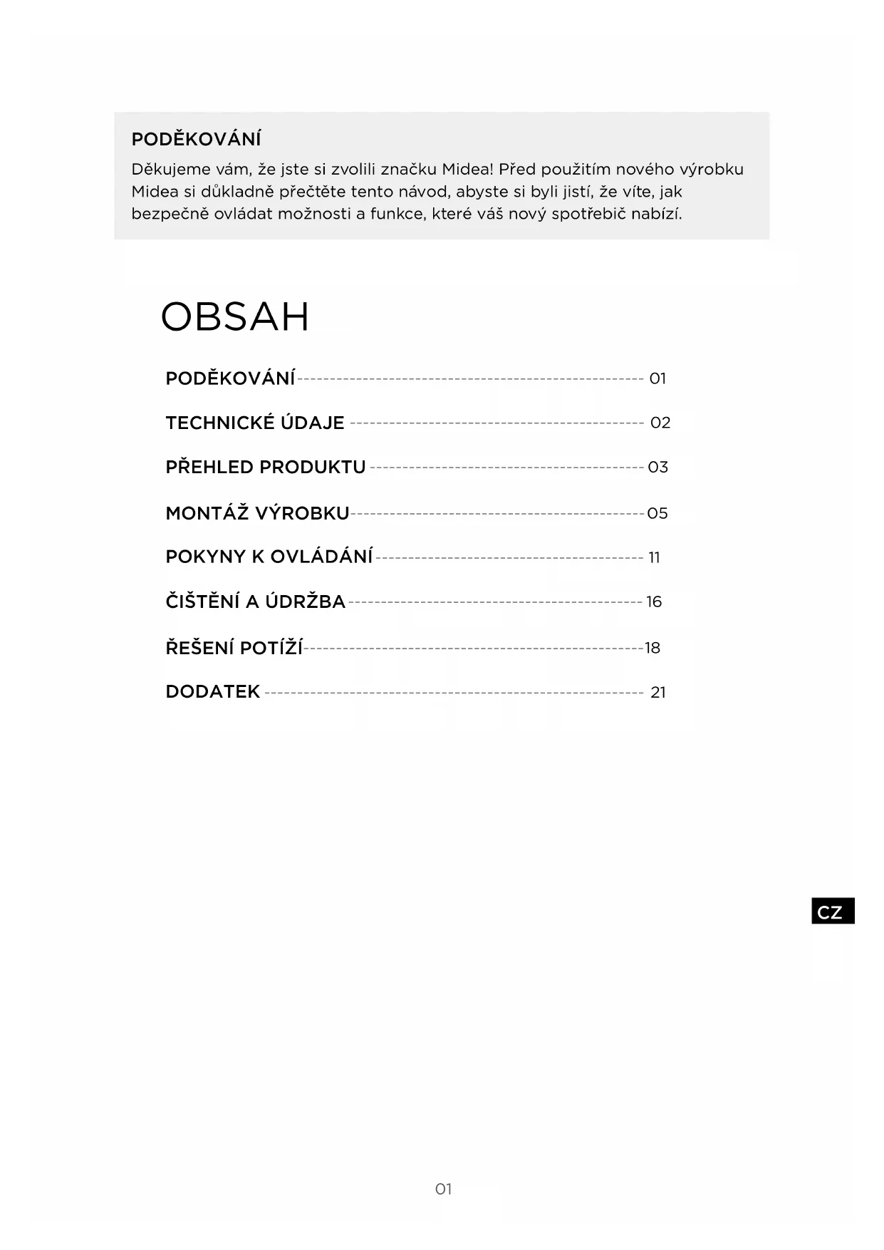 Děkujeme vám, že jste si zvolili značku Midea! Před použitím nového výrobku Midea si důkladně přečtěte tento návod, abyste si byli jistí, že víte, jak bezpečně ovládat možnosti afunkce, které váš nový spotřebič nabízí. OBSAH