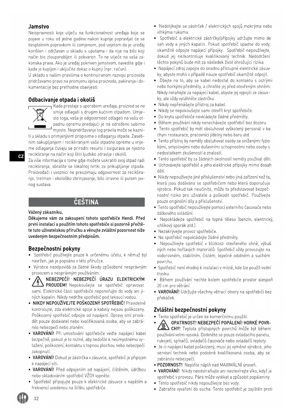 nje, tretman i ekološko zbrinjavanje, bilo izravno ili putem jav- nog sustava. ČEŠTINA Vážený zákazníku, Děkujeme vám za zakoupení tohoto spotřebiče Hendi. Před první instalací a použitím tohoto spotřebiče si pozorně přečtě
