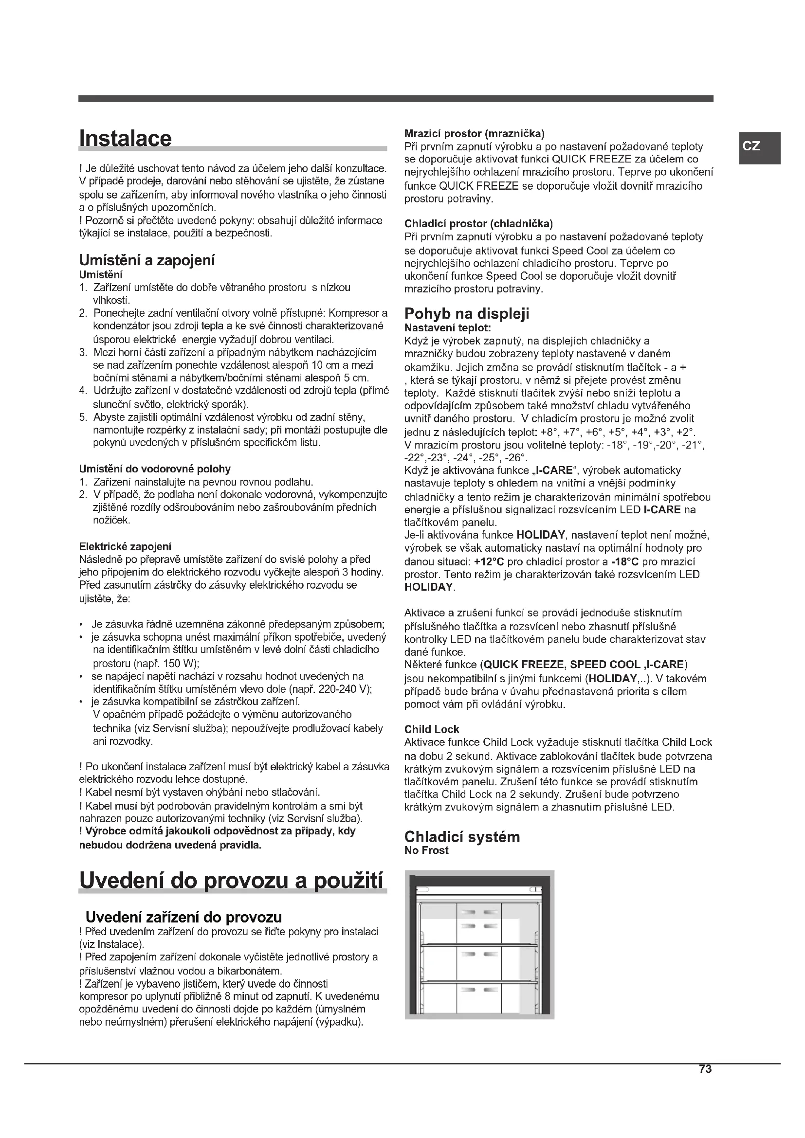 - je zásuvka kompatibilní se zástrčkou zařízení. V opačném případě požádejte o výměnu autorizovaného technika (viz Servisní služba); nepoužívejte prodlužovací kabely ani rozvodky. ! Po ukončení instalace zařízení musí být elektrický kabel a zásuvka elektrického rozvodu lehce dostupné. ! Kabel nesmí být vystaven ohýbání nebo stlačování. ! Kabel musí být podrobován pravidelným kontrolám a smí být nahrazen pouze autorizovanými techniky (viz Servisní služba). ! Výrobce odmítá jakoukoli odpovědnost za případy, kdy nebudou dodržena uvedená pravidla. Uvedení do provozu a použití Uvedení zařízení do provozu ! Před uvedením zařízení do provozu se řiďte pokyny pro instalaci (viz Instalace). ! Před zapojením zařízení dokonale vyčistěte jednotlivé prostory a příslušenství vlažnou vodou a bikarbonátem. ! Zařízení je vybaveno jističem, který uvede do činnosti kompresor po uplynutí přibližně 8 minut od zapnutí. K uvedenému opožděnému uvedení do činnosti dojde po každém (úmyslném nebo neúmyslném) přerušení elektrického napájení (výpadku). Mrazicí prostor (mraznička) Při prvním zapnutí výrobku a po nastavení požadované teploty se doporučuje aktivovat funkci QUICK FREEZE za účelem co nejrychlejšího ochlazení mrazicího prostoru. Teprve po ukončení funkce QUICK FREEZE se doporučuje vložit dovnitř mrazicího prostoru potraviny. Chladicí prostor (chladnička) Při prvním zapnutí výrobku a po nastavení požadované teploty se doporučuje aktivovat funkci Speed Cool za účelem co nejrychlejšího ochlazení chladicího prostoru. Teprve po ukončení funkce Speed Cool se doporučuje vložit dovnitř mrazicího prostoru potraviny. Pohyb na displeji Nastavení teplot: Když je výrobek zapnutý, na displejích chladničky a mrazničky budou zobrazeny teploty nastavené v daném okamžiku. Jejich změna se provádí stisknutím tlačítek - a + , která se týkají prostoru, v němž si přejete provést změnu teploty. Každé stisknutí tlačítek zvýší nebo sníží teplotu a odpovídajícím způsobem také množství chladu vytvářeného uvnitř daného prostoru. V chladicím prostoru je možné zvolit jednu z následujících teplot: +8°, +7°, +6°, +5°, +4°, +3°, +2°. V mrazicím prostoru jsou volitelné teploty: -18°, -19°,-20°, -21°, -22°,-23°, -24°, -25°, -26°. Když je aktivována funkce „I-CARE“, výrobek automaticky nastavuje teploty s ohledem na vnitřní a vnější podmínky chladničky a tento režim je charakterizován minimální spotřebou energie a příslušnou signalizací rozsvícením LED I-CARE na tlačítkovém panelu. Je-li aktivována funkce HOLIDAY, nastavení teplot není možné, výrobek se však automaticky nastaví na optimální hodnoty pro danou situaci: +12°C pro chladicí prostor a -18°C pro mrazicí prostor. Tento režim je charakterizován také rozsvícením LED HOLIDAY. Aktivace a zrušení funkcí se provádí jednoduše stisknutím příslušného tlačítka a rozsvícení nebo zhasnutí příslušné kontrolky LED na tlačítkovém panelu bude charakterizovat stav dané funkce. Některé funkce (QUICK FREEZE, SPEED COOL ,I-CARE) jsou nekompatibilní s jinými funkcemi (HOLIDAY,..). V takovém případě bude brána v úvahu přednastavená priorita s cílem pomoct vám při ovládání výrobku. Child Lock Aktivace funkce Child Lock vyžaduje stisknutí tlačítka Child Lock na dobu 2 sekund. Aktivace zablokování tlačítek bude potvrzena krátkým zvukovým signálem a rozsvícením příslušné LED na tlačítkovém panelu. Zrušení této funkce se provádí stisknutím tlačítka Child Lock na 2 sekundy. Zrušení bude potvrzeno krátkým zvukovým signálem a zhasnutím příslušné LED. Chladicí systém No Frost74