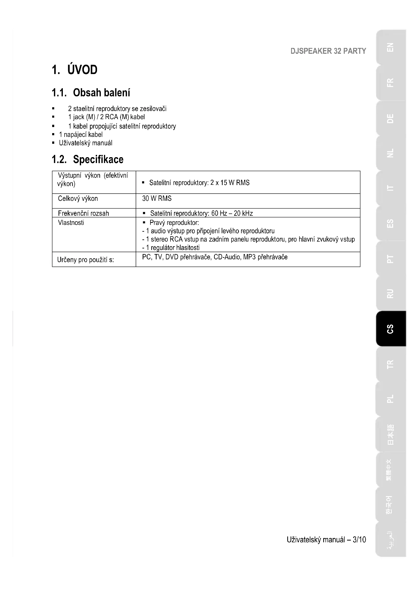 1.1. Obsah balení 2 staelitní reproduktory se zesilovači 1 jack (M) / 2 RCA (M) kabel 1 kabel propojující satelitní reproduktory 1 napájecí kabel Uživatelský manuál 1.2. Specifikace Výstupní výkon (efektivní výkon) Satelitní reproduktory: 2 x 15 W RMS Celkový výkon 30 W RMS Frekvenční rozsah Satelitní reproduktory: 60 Hz – 20 kHz Vlastnosti Pravý reproduktor: - 1 audio výstup pro připojení levého reproduktoru - 1 stereo RCA vstup na zadním panelu reproduktoru, pro hlavní zvukový vstup - 1 regulátor hlasitosti Určeny pro použití s: PC, TV, DVD přehrávače, CD-Audio, MP3 přehrávačeDJSPEAKER 32 PARTY 4/10 – Uživatelský manuál 1.3. Doporučení - Pro zamezení riziku pádu reproduktorů, umísťujte satelitní reproduktory na rovné plochy. - Nikdy reproduktory nerozebírejte, riskujete tímto poškození vnitřních součástek. - Tato souprava reproduktorů je určena pro vnitřní použití za mírných podmínek. - Pro zamezení rizika elektrického výboje, neumísťujte reproduktory do blízkosti: - vlhkosti nebo deště, stejně tak je nevystavujte jakýmkoliv tekutinám (voda, chemické nebo jiné kapaliny), - tepelným zdrojům jako jsou topení, kamna, nebo jiná zařízení vyzařující teplo (včetně zesilovačů), - přímému slunečnímu světlu. - Reproduktory nevystavujte kapající nebo stříkající vodě. - Na reproduktory neumísťujte žádní nádoby na kapaliny (skleněné vázy atd.). - Pokud plánujete, že nebudete používat reproduktorovou soupravu po delší dobu, odpojte napájecí kabel. Pokud chcete odpojit napájecí kabel, uchopte zástrčku a vytáhněte ji; nikdy netahejte za samotný kabel. - Zajistěte, aby napájecí kabel reproduktorů připojený do síťového rozvodu zůstal snadno přístupný. - Před čištěním reproduktorovou soupravu odpojte. Použijte vlhkou tkaninu a vyhněte se použití aerosolových čistících prostředků. - Napájecí zástrčka reproduktorové soupravy slouží pro vypnutí zařízení, a proto musí být vždy snadno přístupná. - Štítek je umístěn na zadní části reproduktorů.