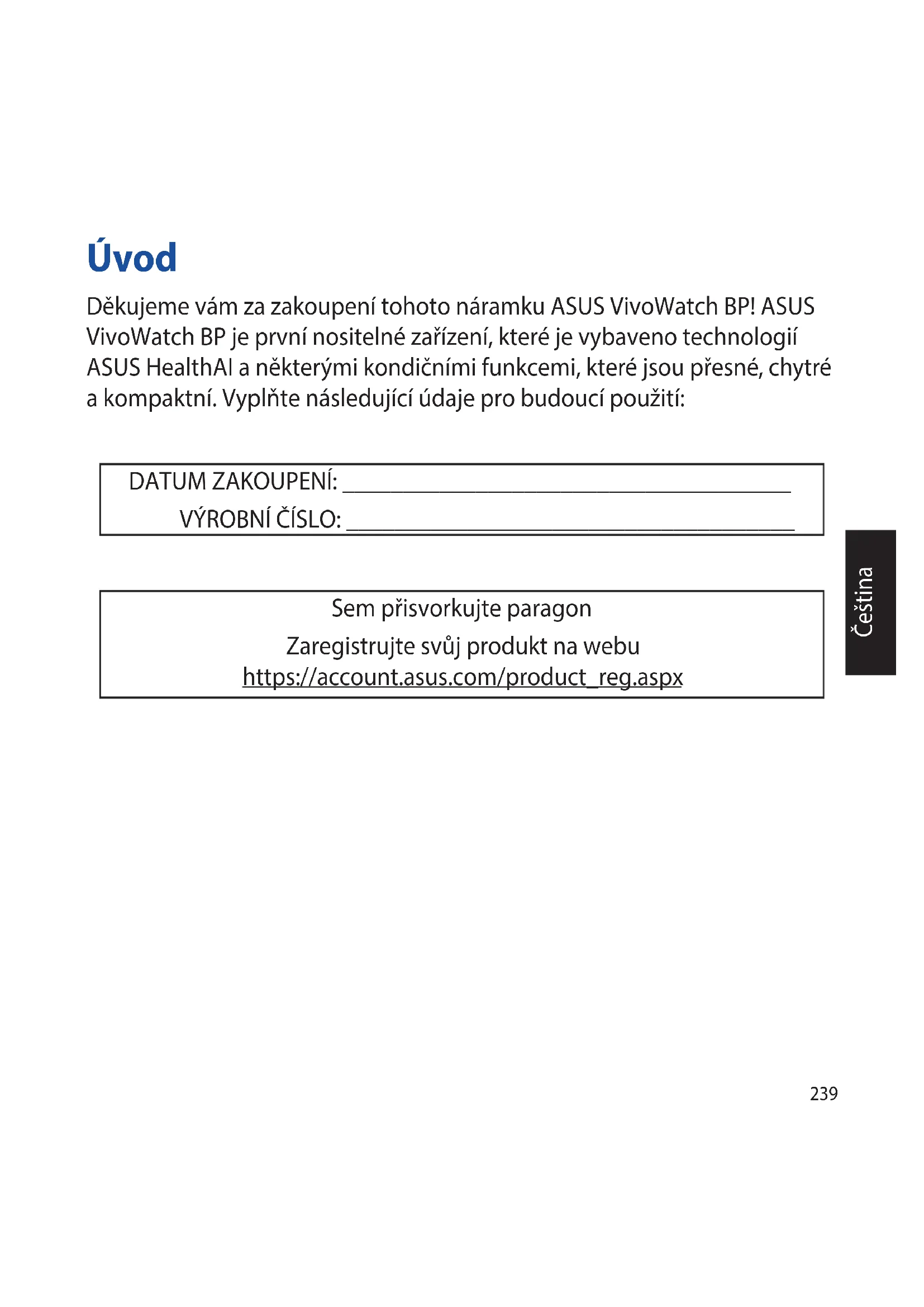 Será apresentada uma mensagem quando a atualização do rmware estiver concluída.239 Čeština Úvod Děkujeme vám za zakoupení tohoto náramku ASUS VivoWatch BP! ASUS VivoWatch BP je první nositelné zařízení, které je vybaveno technologií ASUS HealthAI a některými kondičními funkcemi, které jsou přesné, chytré a kompaktní. Vyplňte následující údaje pro budoucí použití: DATUM ZAKOUPENÍ: _____________________________________