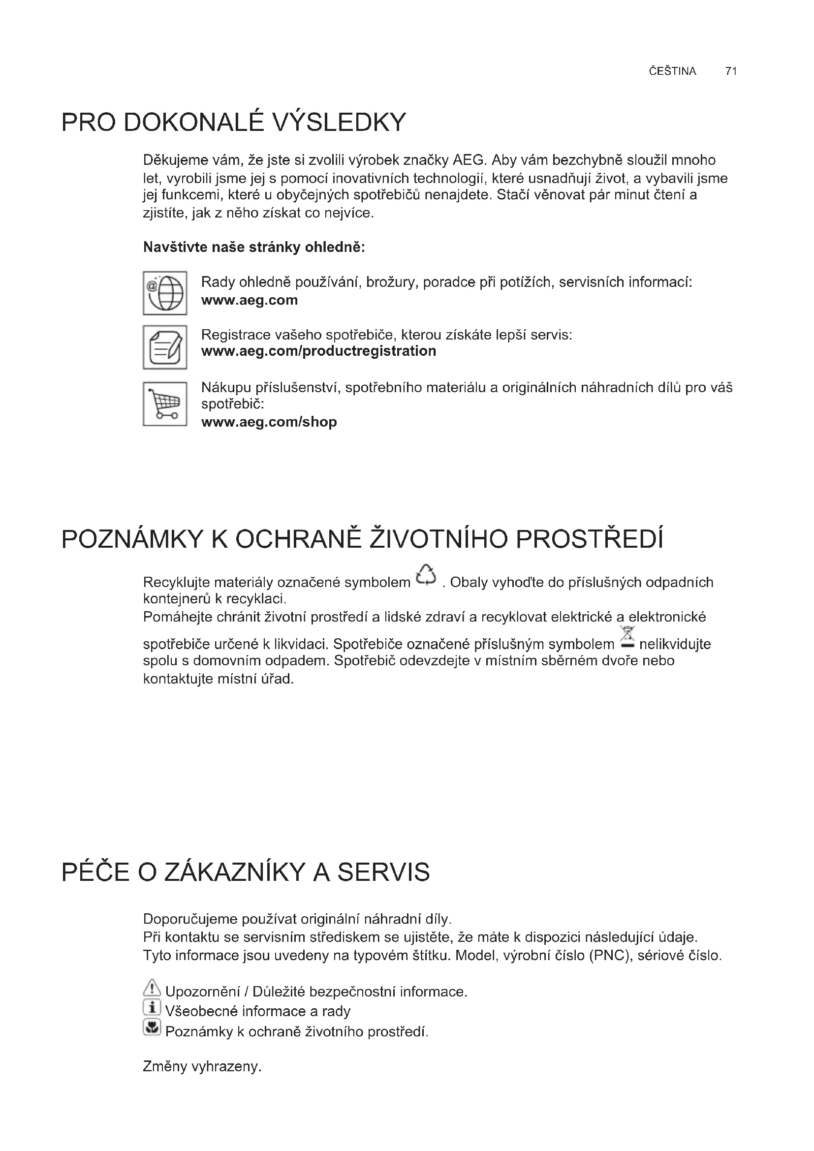 POZNÁMKY K OCHRANĝ ŽIVOTNÍHO PROSTĭEDÍ Recyklujte materiály označené symbolem . Obaly vyhoęte do pĮíslušných odpadních kontejnerĶ k recyklaci. Pomáhejte chránit životní prostĮedí a lidské zdraví a recyklovat elektrické a elektronické spotĮebiče určené k likvidaci. SpotĮebiče označené pĮíslušným symbolem nelikvidujte spolu s domovním odpadem. SpotĮebič odevzdejte v místním sbĞrném dvoĮe nebo kontaktujte místní úĮad. PÉČE O ZÁKAZNÍKY A SERVIS Doporučujeme používat originální náhradní díly. PĮi kontaktu se servisním stĮediskem se ujistĞte, že máte k dispozici následující údaje. Tyto informace jsou uvedeny na typovém štítku. Model, výrobní číslo (PNC), sériové číslo. UpozornĞní / DĶležité bezpečnostní informace. Všeobecné informace a rady Poznámky k ochranĞ životního prostĮedí. ZmĞny vyhrazeny. CS NÁVOD K POUŽITÍwww.aeg.com