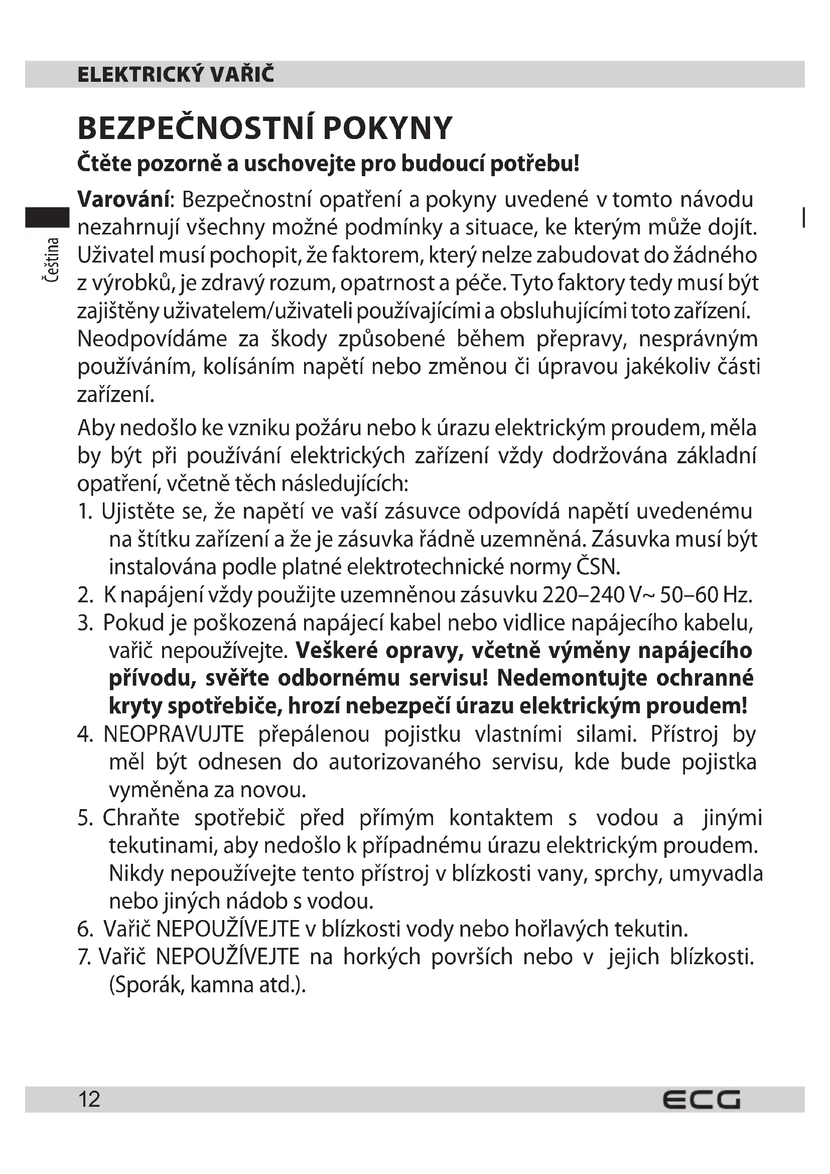 Balicí papír a vlnitá lepenka – odevzdat do sběrných surovin. Přebalová folie, PE sáčky, plastové díly – do sběrných kontejnerů na plasty. LIKVIDACE VÝROBKU PO UKONČENÍ ŽIVOTNOSTI Likvidace použitých elektrických a elektronických zařízení (platí v členských zemích EU a dalších evropských zemích se zavedeným systémem třídění odpadu)Vyobrazený symbol na produktu nebo na obalu znamená, že sproduktem by nemělo být nakládáno jako s domovním odpadem. Produkt odevzdejte na místo určené pro recyklaci elektrických a elektronických zařízení. Správnou likvidací produktu zabráníte negativním vlivům na lidské zdraví a životní prostředí. Recyklace materiálů přispívá kochraně přírodních zdrojů. Více informací orecyklaci tohoto produktu Vám poskytne obecní úřad, organizace pro zpracování domovního odpadu nebo prodejní místo, kde jste produkt zakoupili. Tento výrobek splňuje požadavky směrnic EU o elektromagnetické kompatibilitě a elektrické bezpečnosti. Návod k obsluze je k dispozici na webových stránkách www.ecg.cz. Změna textu a technických parametrů vyhrazena. 08/05Eesti keel Eesti keel
