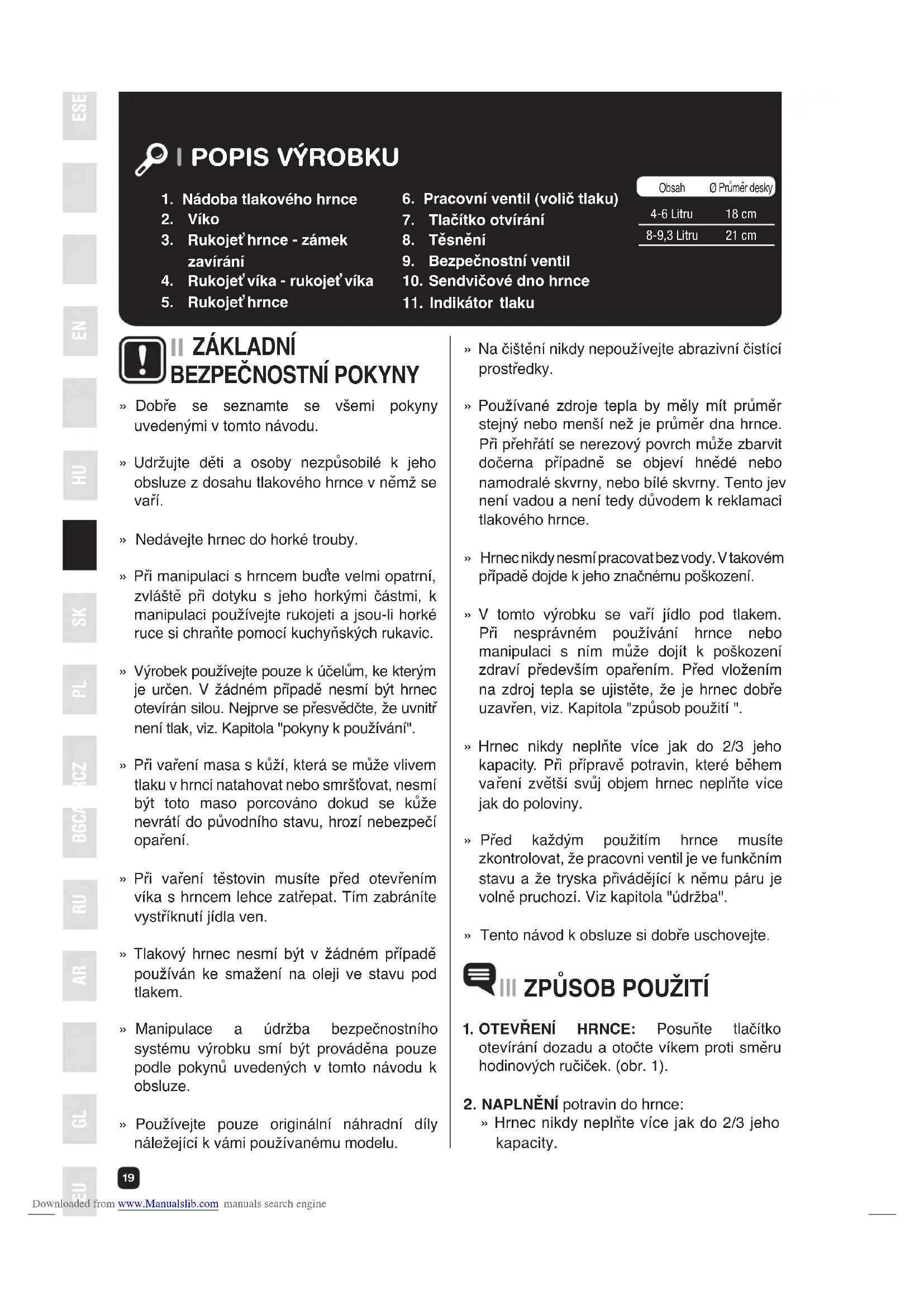 » Hrnec nikdy neplňte více jak do 2/3 jeho kapacity. Obsah Ø Průměr desky 4-6 Litru 8-9,3 Litru 18 cm 21 cm » Dobře se seznamte se všemi pokyny uvedenými v tomto návodu. » Udržujte děti a osoby nezpůsobilé k jeho obsluze z dosahu tlakového hrnce v němž se vaří. » Nedávejte hrnec do horké trouby. » Při manipulaci s hrncem buďte velmi opatrní, zvláště při dotyku s jeho horkými částmi, k manipulaci používejte rukojeti a jsou-li horké ruce si chraňte pomocí kuchyňských rukavic. » Výrobek používejte pouze k účelům, ke kterým je určen. V žádném případě nesmí být hrnec otevírán silou. Nejprve se přesvědčte, že uvnitř není tlak, viz. Kapitola "pokyny k používání". » Při vaření masa s kůží, která se může vlivem tlaku v hrnci natahovat nebo smršťovat, nesmí být toto maso porcováno dokud se kůže nevrátí do původního stavu, hrozí nebezpečí opaření. » Při vaření těstovin musíte před otev řením víka s hrncem lehce zatřepat. Tím zabráníte vystříknutí jídla ven. » Tlakový hrnec nesmí být v žádném případě používán ke smažení na oleji ve stavu pod tlakem. » Manipulace a údržba bezpečnostního systému výrobku smí být prováděna pouze podle pokynů uvedených v tomto návodu k obsluze. » Používejte pouze originální náhradní díly náležející k vámi používanému modelu.