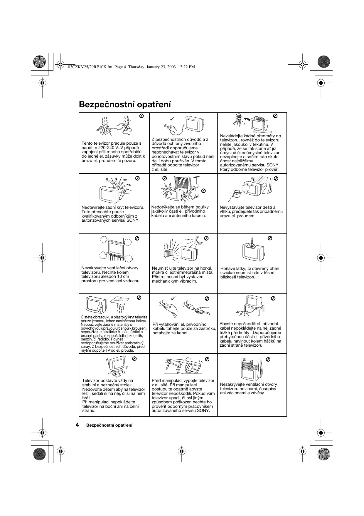 03CZKV25/29RE10K.fm Page 4 Thursday, January 23, 2003 12:22 PM Bezpečnostní opatření Z bezpečnostních důvodů a z důvodů ochrany životního prostředí doporučujeme neponechávat televizor v pohotovostním stavu pokud není del í dobu používán. V tomto případě odpojte televizor z el. sítě. Nevkládejte žádné předměty do televizoru, rovněž do televizoru nelijte jakoukoliv tekutinu. V případě, že se tak stane ať již úmyslně či neúmyslně televizor nezapínejte a sdělte tuto skute čnost nejbližšímu autorizovanému servisu SONY, který odborně televizor prověří. Neotevírejte zadní kryt televizoru. Toto přenechte pouze kvalifikovaným odborníkům z autorizovaných servisů SONY. Nedotýkejte se během bouřky jakékoliv časti el. přívodního kabelu ani anténního kabelu. Nevystavujte televizor dešti a vlhku, předejdete tak případnému úrazu el. proudem. Nezakrývejte ventilační otvory televizoru. Nechte kolem televizoru alespoň 10 cm prostoru pro ventilaci vzduchu. Neumisť ujte televizor na horká, mokrá či extrémněprašná místa. Přístroj nesmí být vystaven mechanickým vibracím. Hořlavé látky, či otevřený oheň (svíčka) neumisť ujte v těsné blizkosti televizoru. Čistěte obrazovku a plastový kryt televize pouze jemnou, lehce navlhčenou látkou. Nepoužívejte žádné materiály s povrchovou úpravou určenou k broušení, nepoužívejte alkalické čističe, čistící a brusné pasty, rozpouštědla jako je líh, benzín, či ředidlo. Rovněž nedoporučujeme používat antistatický spray. Z bezpečnostních důvodů, před mytím odpojte TV od el. proudu. Abyste nepoškodili el. přívodní Při vytahování el. přívodního kabelu tahejte pouze za zástrčku, kabel nepokládejte na něj žádné těžké předměty . Doporučujeme netahejte za kabel. přebytečnou část el. přívodního kabelu navinout kolem háčků na zadní straně televizoru. Tento televizor pracuje pouze s napětím 220-240 V. V případě zapojení příli mnoha spotřebičů do jedné el. zásuvky může dolít k úrazu el. proudem či požáru. Televizor postavte vždy na stabilní a bezpečný stolek. Nedovolte dětem aby na televizor lezli, sedali si na něj, či si na něm hráli. Při manipulaci nepokládejte televizor na boční ani na čelní stranu.