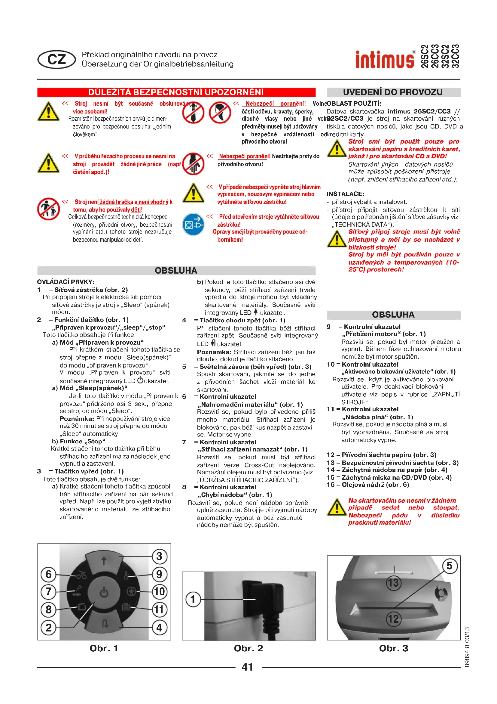 OBSLUHA Obr.1 Obr.4 Překlad originálního návodu na provozÜbersetzung der Originalbetriebsanleitung- Zbylý materiál je nyní automaticky znova zaveden do stříhacího zařízení a je skartován. - Kontrolka (6) zhasne. LED-ukazatel tlačítka vpřed (3) svítí trvale.- Když stříhaný materiál proběhl stříhacím zařízením, lze pokračovat ve skartování se správným dávkováním. - Pokud je to nutné, přepínat manuálně stříhací zařízení střídavě vpřed a zpět tak dlouho, až celý skartovaný materiál proběhne a skartuje se.Při každém přepnutí směru pohybu počkat, až se motor zastaví!OCHRANAMOTORU:Pokud je motor přetěžován, tak se vypne. Kontrolka (9) bliká. Vypněte přístroj pomocí kolébkového vypínače (1). Po ochlazení trvajícím asi 25-40 minut (podle modelu a teploty prostoru) můžete přístroj opět spustit.NAHROMADĚNÍMATERIÁLUVPŘÍSTROJI:(funkceauto-reverse)Pokud se v přístroji nahromadí příliš mnoho materiálu, reaguje stroj následovně:- Stříhací zařízení se zastaví, pak běží kousek zpět (materiál se uvolní) a zastaví se. Motor se vypne.- Rozsvítí se kontrolka (6).Postupujte následovně:Nahromaděnípapíruvpřívodníšachtěnapapír(12)- Papír vyvedený zpět z přívodní šachty (12) odebrat.- Stříhací zařízení nyní běží automaticky vpřed a skartuje zbytky papíru, které zůstaly ve stříhacím zařízení. - Kontrolka (6) zhasne. LED-ukazatel tlačítka vpřed (3) svítí trvale.- Pokračovat se skartací menšího množství papíru. Nahromadění materiálu v bezpečnostní přívodníšachtě(13)- Odebrat zpět vyvedený materiál.Materiál odebírat opatrně, protože hrozí nebezpečí pořezání ostrými hranami rozstříhaných míst!KONTROLNÍSEZNAMPŘIPORUCHÁCH:Pokud přístroj nefunguje, zkontrolujte následující body:- je síťovázástrčkapřipojena k síti?- je přístroj v „módusleep(spánek)“? Viz pod „ENERGETICKY ÚSPORNÁ AUTOMATIKA“.- je aktivováno blokováníuživatele? Viz pod „POUŽITÍ BLOKOVÁNÍ UŽIVATELE“.- je zasunuta záchytnánádoba?- je záchytnánádoba plná? Postupujte podle instrukcí u „VYPRÁZDNĚNÍ ZÁCHYTNÉ NÁDOBY“.- došlo v přístroji k nahromaděnímateriálu? Postupujte podle instrukcí u „NAHROMADĚNÍ MATERIÁLU V PŘÍSTROJI“.- je motor přetížen? Viz pod „OCHRANA MOTORU“. Pokud se nejedná o žádný z výše uvedených kontrolních bodů, informujte prosím Vašeho prodejce. 26SC2 26CC3 32SC2 32CC3