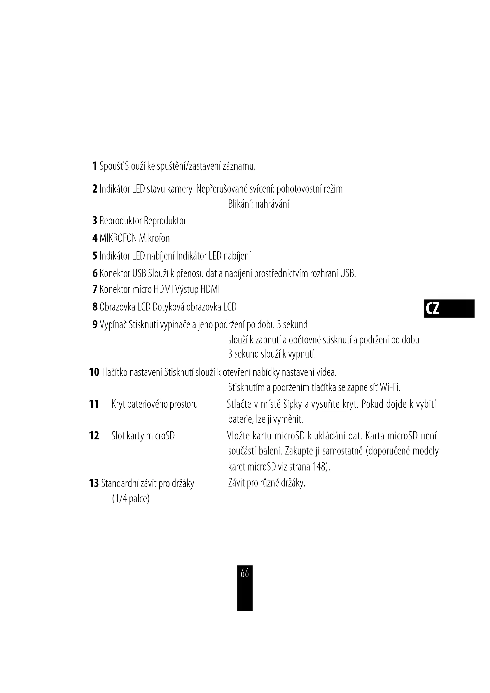 65CZ 1 Spoušť Slouží ke spuštění/zastavení záznamu. 2 Indikátor LED stavu kamery Nepřerušované svícení: pohotovostní režim Blikání: nahrávání 3 Reproduktor Reproduktor 4 MIKROFON Mikrofon 5 Indikátor LED nabíjení Indikátor LED nabíjení 6 Konektor USB Slouží kpřenosu dat a nabíjení prostřednictvím rozhraníUSB. 7 Konektor micro HDMI Výstup HDMI 8 ObrazovkaLCD Dotyková obrazovkaLCD 9 Vypínač Stisknutí vypínače a jeho podržení po dobu 3sekund slouží kzapnutí aopětovné stisknutí a podržení po dobu 3sekund slouží kvypnutí. 10 Tlačítko nastavení Stisknutí slouží kotevření nabídky nastavení videa. Stisknutím a podržením tlačítka se zapne síť Wi-Fi. 11 Kryt bateriového prostoru Stlačte vmístě šipky avysuňte kryt. Pokud dojde kvybití baterie, lze ji vyměnit. 12 Slot karty microSD Vložte kartu microSD kukládání dat. Karta microSD není součástí balení. Zakupte ji samostatně (doporučené modely karet microSD viz strana148). 13 Standardní závit pro držáky (1/4palce) Závit pro různé držáky. 66Ovládání Krok1 Vyjměte kameru. Používáte-li kameru poprvé, vyjměte ji zpouzdra, aby bylo možné vložit kartu microSD, akameru nabijte. Vložte kartu microSD do slotu pro kartu microSD. 67CZ Krok2 Nabijte kameru.