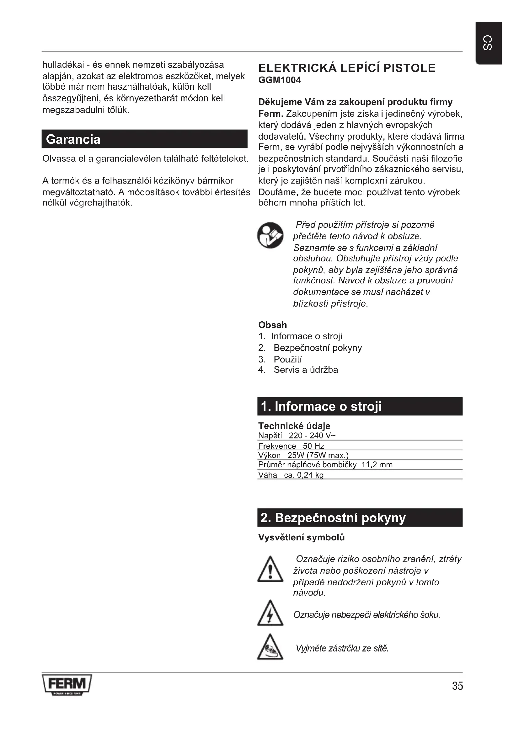 GGM1004 Děkujeme Vám za zakoupení produktu firmy Ferm. Zakoupením jste získali jedinečný výrobek, který dodává jeden z hlavných evropských dodavatelů. Všechny produkty, které dodává firma Ferm, se vyrábí podle nejvyšších výkonnostních a bezpečnostních standardů. Součástí naší filozofie je i poskytování prvotřídního zákaznického servisu, který je zajištěn naší komplexní zárukou. Doufáme, že budete moci používat tento výrobek během mnoha příštích let. Předpoužitímpřístrojesipozorně přečtětetentonávodkobsluze. Seznamte se s funkcemi a základní obsluhou.Obsluhujtepřístrojvždypodle pokynů,abybylazajištěnajehosprávná funkčnost.Návodkobsluzeaprůvodní dokumentace se musí nacházet v blízkostipřístroje. Obsah