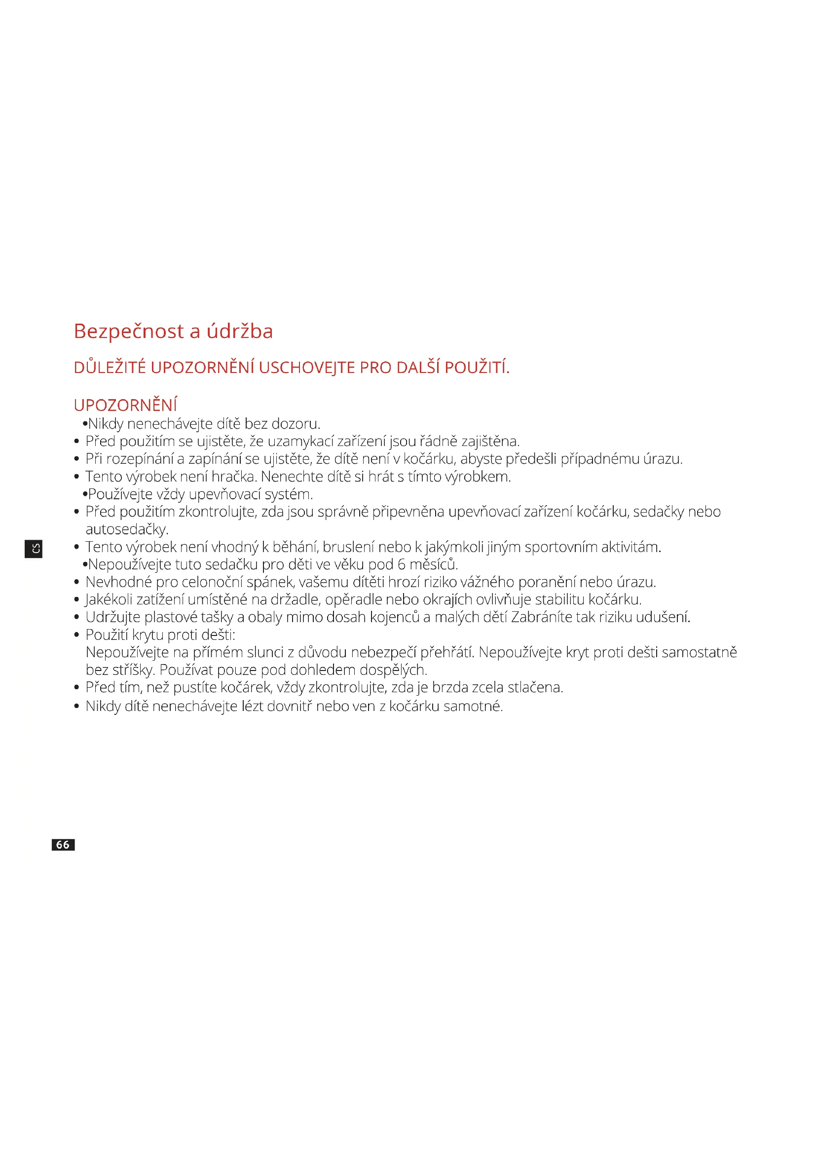 - Použití krytu proti dešti: Nepoužívejte na přímém slunci z důvodu nebezpečí přehřátí. Nepoužívejte kryt proti dešti samostatně bez stříšky. Používat pouze pod dohledem dospělých.