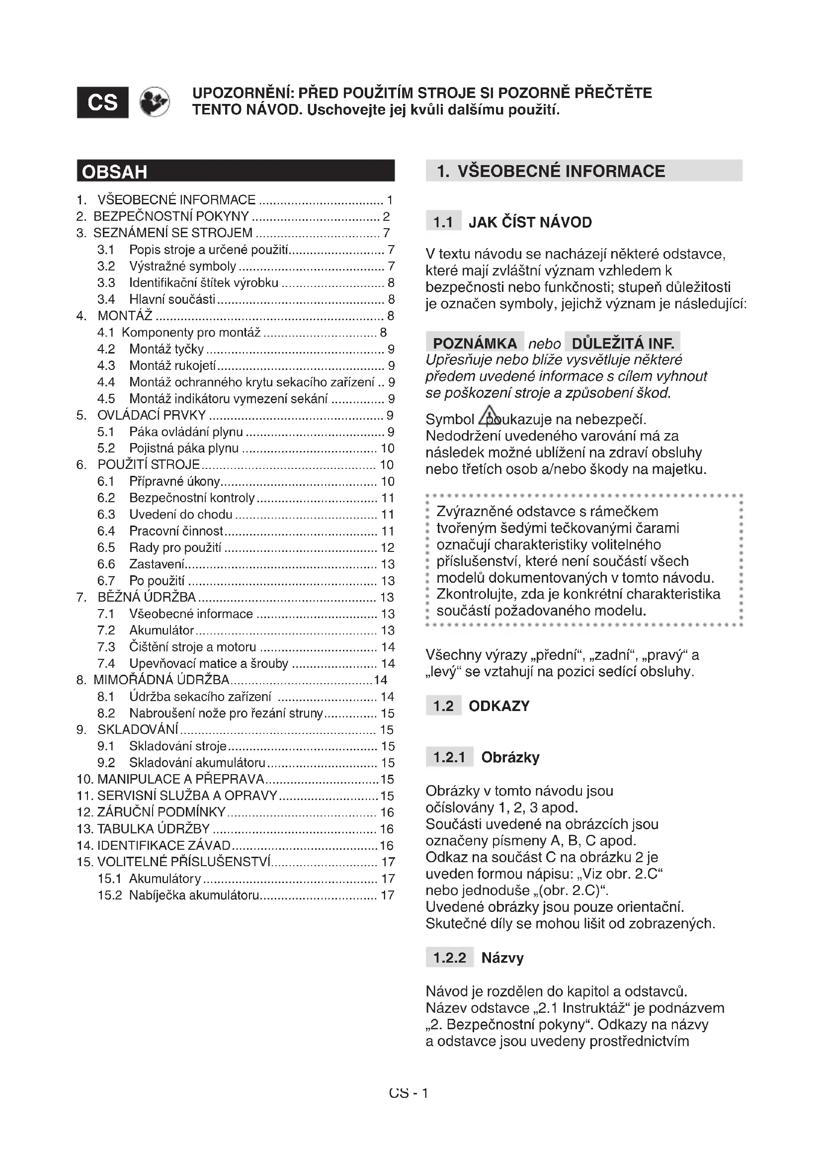 - Při vyřazení stroje z provozu jej nenechávejte volně v přírodě, ale obraťte se na sběrné středisko v souladu s platnými místními předpisy Nevyhazujte elektrická zařízení do domovního odpadu. Podle Evropské směrnice 2012/19/EU o odpadu tvořeném elektrickými a elektronickými zařízeními a její aplikace v podobě národních norem musí být elektrická zařízení po skončení své životnosti odevzdána do sběru odděleně za účelem jejich eko- kompatibilní recyklace. Když se elektrická zařízení likvidují na smetišti nebo volně v přírodě, škodlivé látky mohou proniknout do podzemních vod a dostat se do potravinového řetězce, čímž mohou poškodit vaše zdraví a zdravotní pohodu. Pro získání podrobnějších informací o likvidaci tohoto výrobku se obraťte na kompetentní organizaci, zabývající se ekologickou likvidací domovního odpadu, nebo na vašeho Prodejce. Po skončení životnosti akumulátorů proveďte jejich likvidaci a věnujte přitom pozornost našemu životnímu prostředí. Akumulátor obsahuje materiál, který je nebezpečný pro vás i pro životní prostředí. Je třeba jej odepnout a zlikvidovat samostatně ve sběrném středisku, které likviduje také akumulátory s ionty lithia. Separovaný sběr použitých výrobků a obalů umožňuje recyklaci materiálů a jejich opětovné použití. Opětovné použití recyklovaných materiálůCS - 7 pomáhá předcházet znečištění životního prostředí a snižuje poptávku po prvotních surovinách.
