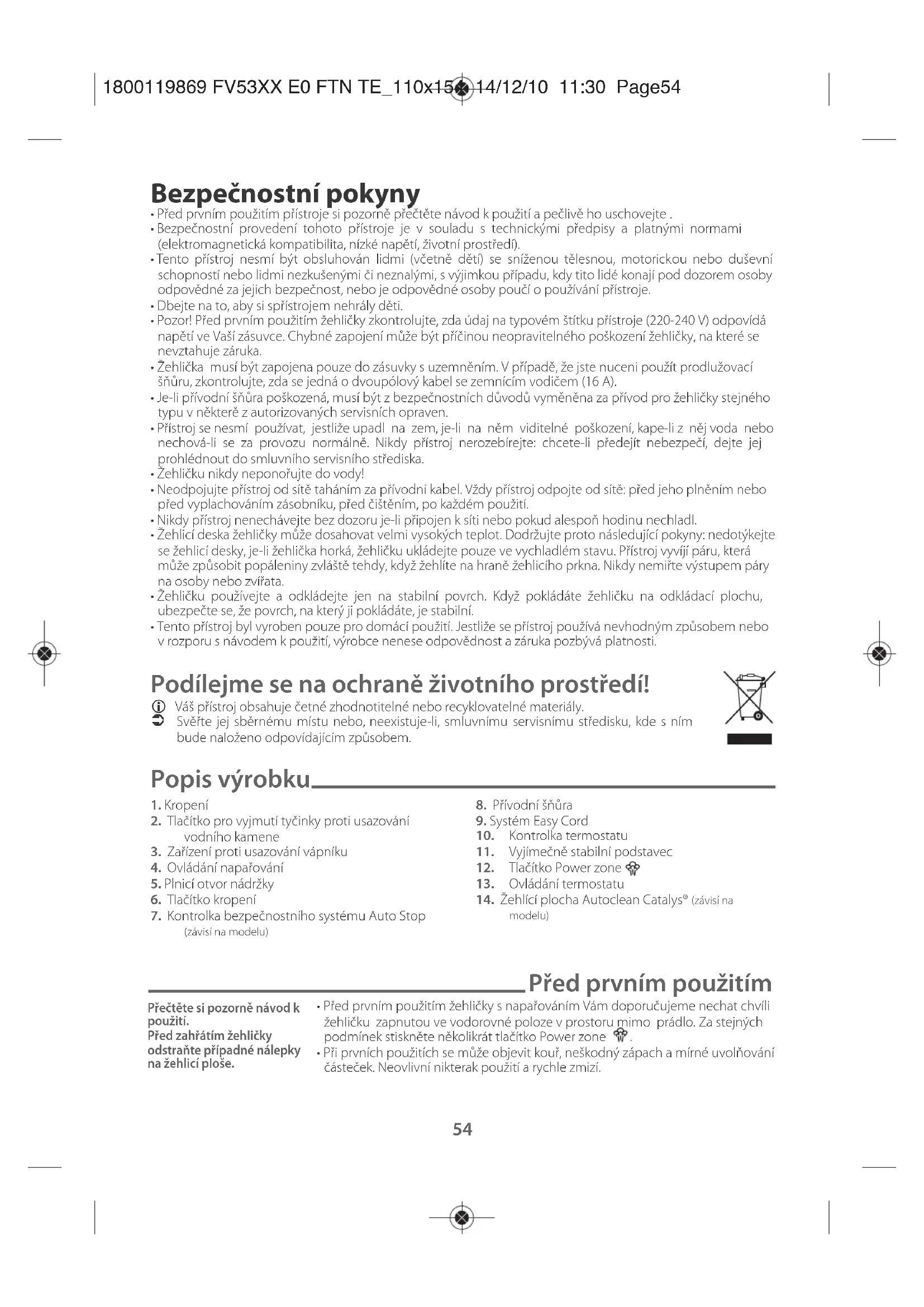 - Při prvních použitích se může objevit kouř, neškodný zápach a mírné uvolňování částeček. Neovlivní nikterak použití a rychle zmizí. Přečtěte si pozorně návod k použití. Před zahřátím žehIičky odstraňte případné nálepky na žehlicí pIoše. 1800119869 FV53XX E0 FTN TE_110x154 14/12/10 11:30 Page54EN