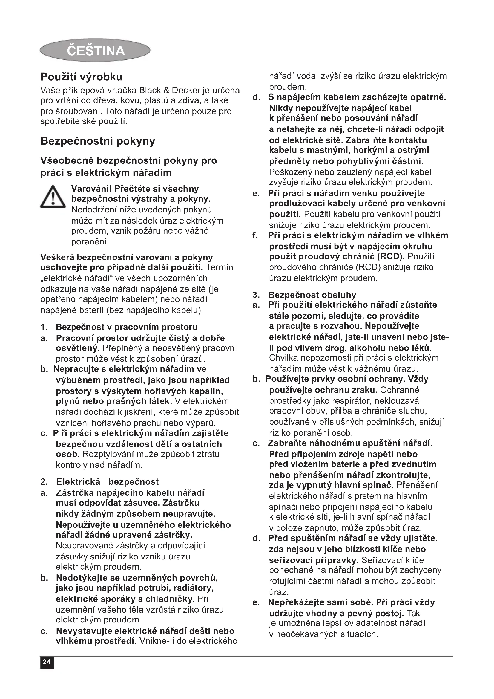 a. Opravy elektrického nářadí svěřte pouze kvalifi kovanému technikovi, který bude používat originální náhradní díly. Tím zajistíte bezpečný provoz nářadí. Doplňkové bezpečnostní pokyny pro práci s elektrickým nářadím Varování! Doplňkové bezpečnostní pokyny pro vrtačky a příklepové vrtačky ♦ Při práci s příklepovými vrtačkami používejte ochranu sluchu. Nadměrná hlučnost může způsobit ztrátu sluchu. ♦ Používejte přídavné rukojeti dodávané s nářadím. Ztráta kontroly nad nářadím může vést k úrazu. ♦ Při pracovních operacích, u kterých by mohlo dojít ke kontaktu pracovního nástroje se skrytými vodiči nebo s vlastním napájecím kabelem, držte elektrické nářadí vždy za izolované rukojeti. Při kontaktu pracovního nástroje s „živým“ vodičem způsobí neizolované kovové části nářadí obsluze úraz elektrickým proudem ♦ Nikdy nepoužívejte sekáče v režimu vrtání. Příslušenství se v materiálu zasekne a bude se otáčet vrtačka. ♦ Pro zajištění a upnutí obrobku k pracovnímu stolu používejte svorky nebo jiné vhodné prostředky. Držení obrobku rukou nebo opření obrobku o část těla nezajistí jeho stabilitu a mů že vést k ztrátě kontroly. ♦ Před vrtáním do zdí, podlah nebo stropů zjistěte polohu elektrických vedení a potrubí. ♦ Ihned po ukončení vrtání se nedotýkejte vrtáku, protože může být horký. ♦ Použití tohoto výrobku je popsáno v tomto návodu. Použití jiného příslušenství nebo přídavného zařízení a provádění jiných pracovních operací než je doporučeno tímto návodem, může představovat riziko zranění obsluhy nebo riziko způsobení hmotných škod. Bezpečnost ostatních osob ♦ Tento výrobek není určen k použití osobami (včetně dětí) se sníženými fyzickými, smyslovými nebo duševními schopnostmi, nebo s nedostatkem zkušeností a znalostí, pokud těmto osobám nebyl stanoven dohled, nebo pokud jim nebyly poskytnuty instrukce týkající se použití výrobku osobou odpovědnou za jejich bezpečnost.26 ČEŠTINA ♦ Děti by měly být pod dozorem, aby si s nářadím nehrály. Zbytková rizika Je-li nářadí používáno jiným způsobem, než je uvedeno v přiložených bezpečnostních varováních, mohou se objevit dodatečná zbytková rizika. Tato rizika mohou vzniknout v důsledku nesprávného použití, dlouhodobého použití atd. Přestože jsou dodržovány příslušné bezpečnostní předpisy a jsou používána bezpečnostní zařízení, určitá zbytková rizika nemohou být vyloučena. Tato rizika jsou následující: ♦ Zranění způsobená kontaktem s jakoukoli rotující nebo pohybující se částí. ♦ Zranění způsobená při výměně dílů, pracovního nástroje nebo příslušenství. ♦ Zranění způsobená dlouhodobým použitím nářadí. Používáte-li jakékoli nářadí delší dobu, zajistěte, aby byly prováděny pravidelné přestávky. ♦ Poškození sluchu. ♦ Zdravotní rizika způsobená vdechováním prachu vytvářeného při použití nářadí (příklad: - práce se dřevem, zejména s dubovým, bukovým a MDF). Vibrace Deklarovaná úroveň vibrací uvedená v technických údajích a v prohlášení o shodě byla měřena v souladu se standardní zkušební metodou předepsanou normou EN 60745 a může být použita pro srovnání jednotlivých nářadí mezi sebou. Deklarovaná úroveň vibrací může být také použita k předběžnému stanovení doby práce s tímto nářadím. Varování! Úroveň vibrací při aktuálním použití elektrického nářadí se může od deklarované úrovně vibrací lišit v závislosti na způsobu použití nářadí. Úroveň vibrací může být oproti uvedené hodnotě vyšší. Při stanovení doby působení vibrací, z důvodu určení bezpečnostních opatření podle normy 2002/44/EC k ochraně osob pravidelně používajících elektrické nářadí v zaměstnání, by měl předběžný odhad působení vibrací brát na zřetel aktuální podmínky použití nářadí s přihlédnutím na všechny části pracovního cyklu, jako jsou doby, př i které je nářadí vypnuto a kdy běží naprázdno. Štítky na nářadí Na nářadí jsou následující piktogramy: Varování! Z důvodu snížení rizika způsobení úrazu si uživatel musí přečíst tento návod k obsluze. Elektrická bezpečnost Toto nářadí je opatřeno dvojitou izolací. Proto není nutné použití uzemňovacího vodiče. Vždy zkontrolujte, zda napájecí napětí odpovídá napětí na výkonovém štítku. ♦ Je-li poškozen napájecí kabel, musí být vyměněn výrobcem nebo v autorizovaném servisu Black & Decker, aby bylo zabráněno možným rizikům. Popis Toto nářadí se skládá z některých nebo ze všech následujících částí.