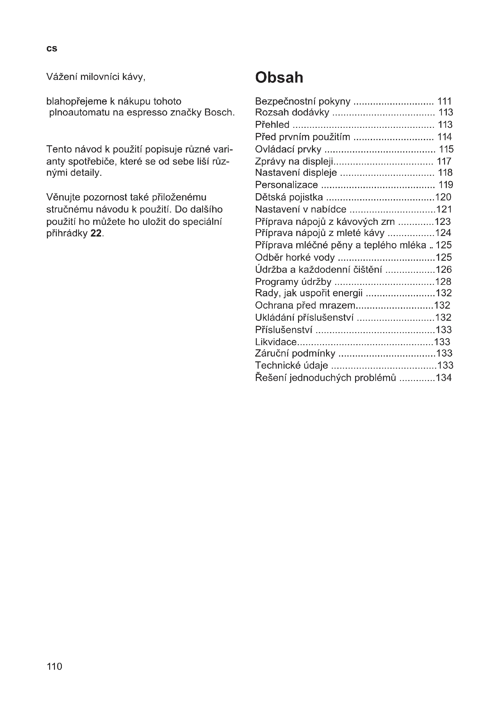 - Obsah Vážení milovníci kávy, blahopřejeme k nákupu tohoto plnoautomatu na espresso značky Bosch. Tento návod k použití popisuje různé vari- anty spotřebiče, které se od sebe liší růz- nými detaily. Věnujte pozornost také přiloženému stručnému návodu k použití. Do dalšího použití ho můžete ho uložit do speciální přihrádky 22. Bezpečnostní pokyny p. 111