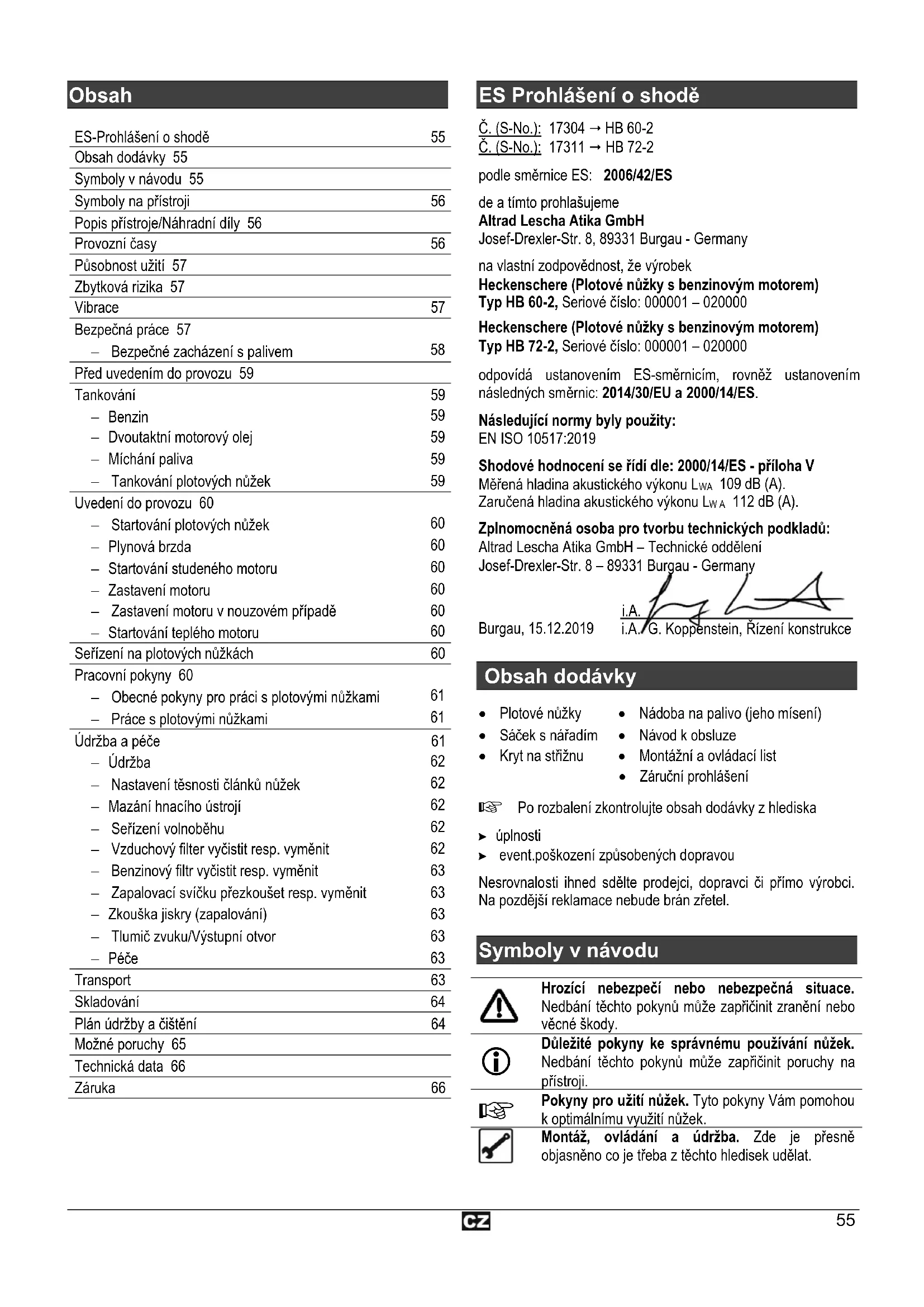 ES Prohlášení o shodě Č. (S-No.): 17304 HB 60-2 Č. (S-No.): 17311 HB 72-2 podle směrnice ES: 2006/42/ES de a tímto prohlašujeme Altrad Lescha Atika GmbH Josef-Drexler-Str. 8, 89331 Burgau - Germany na vlastní zodpovědnost, že výrobek Heckenschere (Plotové nůžky s benzinovým motorem) Typ HB 60-2, Seriové číslo: 000001 – 020000 Heckenschere (Plotové nůžky s benzinovým motorem) Typ HB 72-2, Seriové číslo: 000001 – 020000 odpovídá ustanovením ES-směrnicím, rovněž ustanovením následných směrnic: 2014/30/EU a 2000/14/ES. Následující normy byly použity: EN ISO 10517:2019 Shodové hodnocení se řídí dle: 2000/14/ES - příloha V Měřená hladina akustického výkonu L