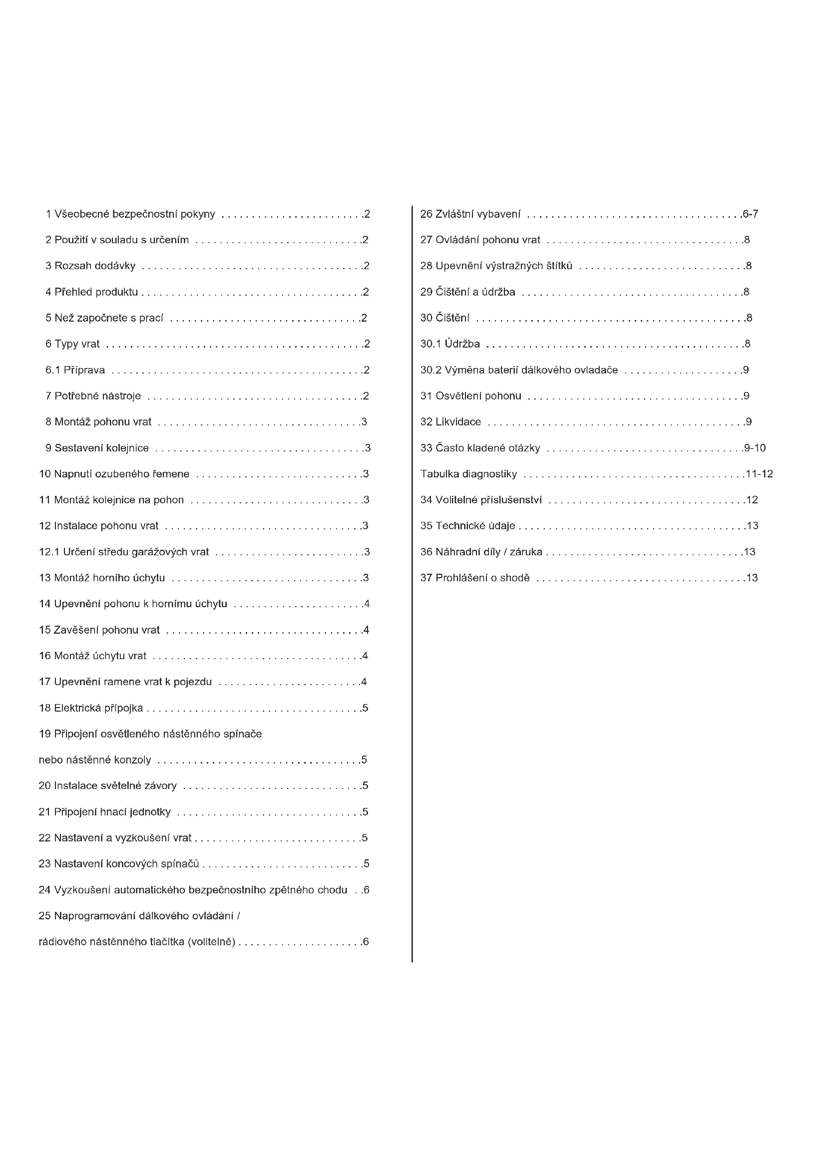 Pečlivě si prosím tyto pokyny přečtěte. POZOR! - Vrata musí být vyvážená. Nepohyblivá nebo zaseknutá vrata je nutné opravit. Garážová vrata, pružiny vrat, kabely, kotouče, úchyty a kolejnice jsou pak extrémně zatěžovány a mohou způsobit těžké poranění. Nepok- oušejte se vrata uvolnit, pohnout s nimi nebo je vyrovnat, nýbrž se obraťte na servisní službu nebo specialistu v oblasti instalování bran. - Při instalaci resp. údržbě pohonu vrat se nesmí nosit žádné ozdoby, hodinky nebo volný oděv. - Aby se zabránilo těžkému poranění následkem zachycení, je nutné odmontovat všechna na vrata napojená lana a řetězy před tím, než instalujete pohon vrat. - Při instalaci a připojení na elektrický proud musí být dodrženy místní platné stavební předpisy a předpisy pro elektroinstalace. Tento přístroj splňuje třídu ochrany 2 a nepotřebuje uzemnění. - Aby u obzvláště lehkých vrat (např. vrata ze skelného vlákna, hliníku nebo oceli) nedošlo k poškození, musí být instalováno příslušné vyz- tužení. Obraťte se prosím v této věci na výrobce vrat. - Automatický bezpečnostní zpětný chod musí být vyzkoušen. Při kontaktu s překážkou na zemi vysokou 50 mm garážová vrata MUSÍ zajet zpět. Nesprávné nastavení pohonu vrat může při zavírání vrat způsobit těžké poranění. Zkoušku opakujte jednou za měsíc a případně proveďte potřeb- né úpravy. - Toto zařízení nesmí být instalováno ve vlhkých nebo mokrých prostorách. - Při provozu nesmí vrata za žádných okolností omezovat cesty pro prů- chod veřejnosti. - Aby všechny osoby měly bezpečné ovládání neustále na paměti, je třeba vedle osvětleného nástěnného spínače umístit výstražný štítek na ochranu dětí. Výstražné štítky varující před skřípnutím je třeba umístit tak, aby byly dobře viditelné. - Je třeba dohlížet na děti, aby se zajistilo, že si s přístrojem nehrají. - Tento přístroj není určen k tomu, aby byl používán osobami (včetně dětí) s omezenými fyzickými, senzorickými nebo duševními schopnostmi, nebo s nedostatečnými zkušenostmi a/nebo nedostatečnými vědomost- mi, ledaže by na ně dohlížela osoba odpovídající za jejich bezpečnost nebo by od ní obdržely pokyny, jak se má přístroj používat. - Aby se zabránilo poškození vrat, musí se deaktivovat všechny stávající zamykací prvky / zámky. - Případná instalovaná ovládací zařízení MUSÍ být instalovaná v dohledu vrat a mimo dosah dětí. Dětem se nesmí povolit ovládání tlačítek nebo dálkových ovladačů. Následkem nesprávného použití pohonu vrat může dojít k závažným poraněním. - Pohon vrat se smí ovládat JEN tehdy, když má ovládající osoba přehled o celé oblasti vrat, ve které neleží žádné překážky, a když je pohon vrat řádně nastaven. Nikdo nesmí vraty procházet, dokud jsou v pohybu. Dětem nesmí být povoleno si hrát v blízkosti vrat. - Ruční odblokování používejte jen k oddělení pojezdu od pohonu a – pokud možno – JEN když jsou vrata zavřena. Červené madlo nepoužívejte k vytažení vrat nahoru resp. ke stažení dolů. - Před prováděním oprav nebo odmontováním krytů je nutné odpojit pohon vrat od elektrického napájení. - Tento výrobek je vybaven transformátorem se speciálním kabelem. Při poškození MUSÍ být vyměněn příslušně kvalifikovanými odbornými pra- covníky za originální transformátor. - Při aktivaci nouzového odblokování se vrata mohou nekontrolovaně pohy- bovat, když jsou pružiny slabé nebo zlomené nebo když vrata nejsou vyvážená. - Odblokovací úchyt pro nouzové odblokování instalujte do výšky minimál- ně 1,8 m. Tyto pokyny bezpodmínečně uchovejte.Použití v souladu s určením Přístroj je určen k otevírání a zavírání výklopných a sekčních garážových vrat v soukromých prostorách. Přístroj není navržen a není vhodný ke komerčnímu použití, nýbrž výlučně k použití se soukromými garážovými vraty, která jsou určena pro samostatnou domácnost. Každé použití pohonu v rozporu s určením sebou nese značné nebezpečí nehody. Výrobce nepřevezme žádné ručení za použití, které bylo v rozporu s určením. Rozsah dodávky Zkontrolujte prosím před montáží, zda jsou dodané součásti kompletní. Upozornění: Číslování platí jen pro příslušnou kapitolu. Přehled produktu Tento obrázek podává při postupné montáži zařízení vždy kompletní přehled hotově smontovaného zařízení. Přehled součástí (hnací hlava):
