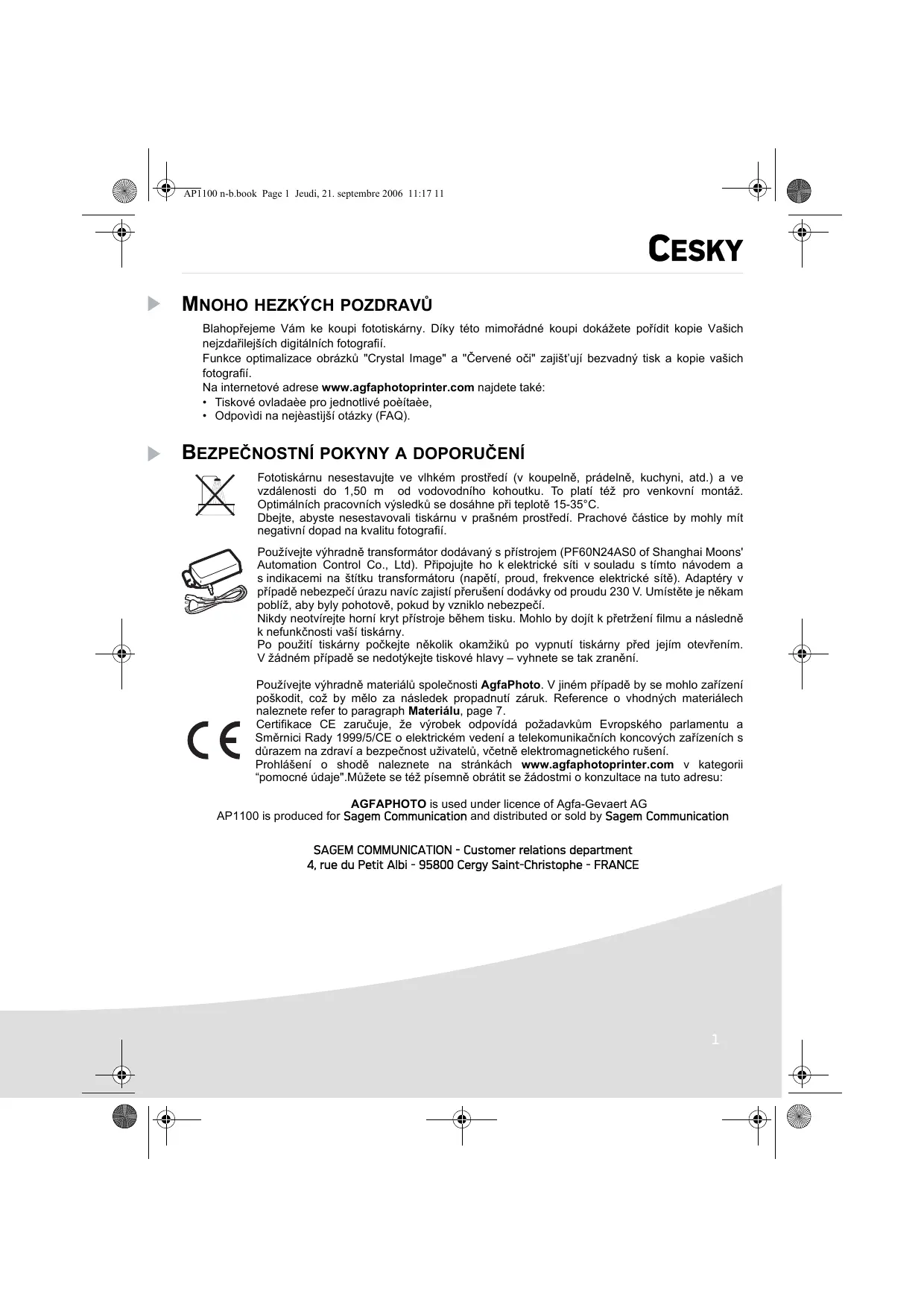 Ne pas installer votre imprimante photo ni dans une pièce humide (salle d'eau, salle de bain, buanderie, cuisine, etc..) à moins de 1,50 m d'un point d'eau ni en extérieur. Votre imprimante doit être utilisée à une température ambiante comprise entre 15 °C et 35 °C pour un rendu d’impression optimal. Ne pas installer votre imprimante dans un endroit poussiéreux, ces poussières pourraient dégrader la qualité d’impression de vos photos. Utilisez exclusivement le bloc secteur fourni (PF60N24AS0 of Shanghai Moons' Automation Control Co., Ltd), raccordez celui-ci sur le secteur conformément aux instructions d'installation de ce livret et aux indications portées sur l'étiquette d'identification apposée sur celui-ci (tension, courant, fréquence du réseau électrique). Par précaution, en cas de danger, les adaptateurs secteur servent de dispositif de sectionnement de l'alimentation 230 V. Ils doivent être situés à proximité de l'appareil et être aisément accessibles. Ne jamais ouvrir le capot supérieur en cours d'impression, vous risquez la rupture du film et par la suite un dysfonctionnement de votre imprimante. Après l’utilisation de l’imprimante, attendez quelques instants après la mise hors tension de l’imprimante avant de l’ouvrir. Pour éviter toute blessure, ne touchez en aucun cas la tête d’impression. Utilisez seulement les consommables de marque AgfaPhoto et exclusivement ceux-ci sinon vous risquez d'endommager l'appareil et de perdre la garantie. Pour connaître les références des consommables reportez-vous au paragraphe Consommables, page 7. Le marquage CE atteste de la conformité du produit aux exigences essentielles de la directive 1999/5/CE du Parlement et du Conseil Européen concernant les équipements terminaux de télécommunication, pour la sécurité et la santé des usagers, pour les perturbations électromagnétiques. La déclaration de conformité peut être consultée sur le site www.agfaphotoprinter.com ou peut être demandée à l'adresse suivante: AGFAPHOTO is used under licence of Agfa-Gevaert AG AP1100 is produced for Sagem Communication and distributed or sold by Sagem Communication SAGEM COMMUNICATION - Customer relations department Pour faciliter ce recyclage, veuillez respecter les règles de tri mises en place localement pour ce type de déchets. LES PILES ET BATTERIES Si votre produit contient des piles ou des batteries, ces dernières doivent être déposées dans les points de collecte désignés. LE PRODUIT La poubelle barrée apposée sur le produit ou ses accessoires signifie qu'ils appartiennent à la famille des équipements électriques et électroniques. A ce titre, la réglementation européenne vous demande de procéder à sa collecte sélective : - dans les points de distribution en cas d'achat d'un équipement équivalent, - dans les points de collecte mis à votre disposition localement (déchetterie, collecte sélective, etc.). Ainsi, vous participez à la réutilisation et à la valorisation des Déchets d'Equipement Electriques et Electroniques qui peuvent avoir des effets potentiels sur l'environnement et la santé humaine.