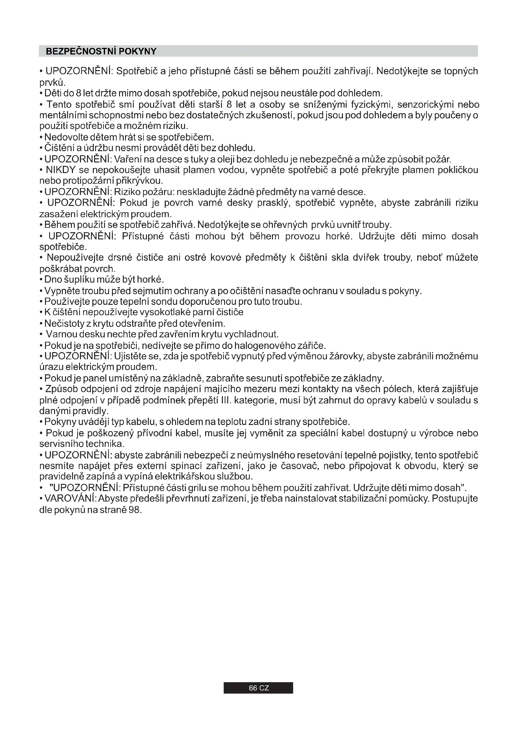 - Pokud je spotřebič v provozu, některé díly spotřebiče mhou být horké. Při prvním zapnutí spotřebiče může z něj vystupovat kouř a zápach. Nepředstavuje to závadu, doporučujeme zapnout prázdnou troubu na 2 hodiny. Pokud nedodržíte výše uvedené pokyny, výrobce nemůže zaručit bezpečnost spotřebiče.