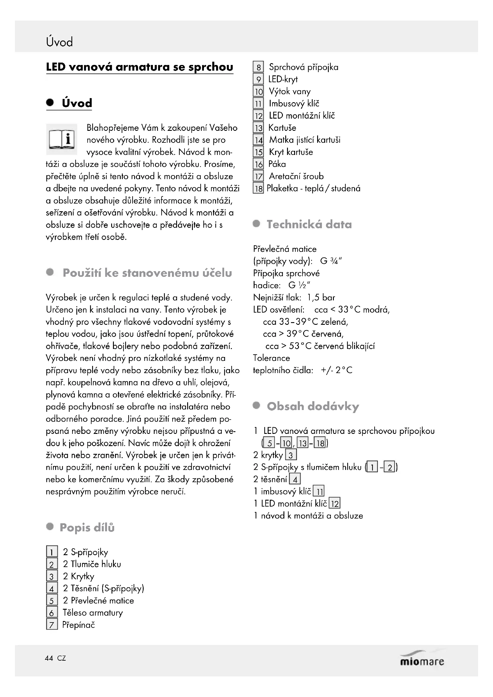 značící teplou a studenou vodu. Správné umístění: nahoře = červená (teplá voda), dole = modrá (studená voda). Zlikvidování Obal se skládá zekologických materiálů, které můžete zlikvidovat prostřednictvím místních sběren recyklovatelných materiálů. O možnostech likvidace vysloužilých zařízení se informujte u správy vaší obce nebo města.48 CZ Informace / Záruka a servis Informace Kvalita vodovodní vody Informujte se u Vašich místních úřadů o kvalitě vody ve Vaší obci nebo městě. Zásadně platí pro pití vody z vodovodního potrubí: Jestliže stála voda v potrubí déle než 4 hodiny, nechte ji před pitím nejdříve krátce odtéct. Nepoužívejte odstátou vodu k přípravě jídel a nápojů, obzvlášť ne pro kojence. Jinak může dojít ke zdravotním potížím. Čerstvá voda je, vytékající z potrubí, citelně chladnější než od- státá. Nepoužívejte odstátou vodu z chromovaných potrubí na přípravu výživy nebo k mytí, jestliže jste alergičtí na nikl. Tato voda může obsahovat nikl a vyvolat alergické reakce. Nepoužívejte pitnou vodu z olověného potrubí k přípravě kojenecké výživy nebo během těho- tenství na přípravu jídel. Potrubí předává olovo do pitné vody, které je pak pro kojence a malé děti obzvlášť zdravotně závadná. Záruka a servis Výrobek byl vyroben s nejvyšší pečlivostí podle přísných kvalitativních směrnic a před odesláním prošel výstupní kontrolou. V případě závad máte možnost uplatnění zákonných práv vůči prodejci. Vaše práva ze zákona nejsou omezena naší níže uvedenou zárukou. Na tento artikl platí 5 záruka od data zakoupení. Záruční lhůta začíná od data zakoupení. Uscho- vejte si dobře originál pokladní stvrzenky. Tuto stvr- zenku budete potřebovat jako doklad o zakoupení. Pokud se do 5 let od data zakoupení tohoto výrobku vyskytne vada materiálu nebo výrobní vada, výrobek Vám – dle našeho rozhodnutí – bezplatně opra- víme nebo vyměníme. Tato záruka zaniká, jestliže se výrobek poškodí, neodborně použil nebo neob- držel pravidelnou údržbu. Záruka platí na vady materiálu a výrobní vady. Tato záruka se nevztahuje na díly výrobku podléhající opotřebení (např. na baterie), dále na poškození křehkých, choulostivých dílů, např. vypínačů, aku- mulátorů nebo dílů zhotovených ze skla. Zákaznický servis Conmetall Meister GmbH Oberkamper Str. 39 Příjem zboží brána 3 DE-42349 Wuppertal NĚMECKO Tel. 0202 24750 430 / 431 / 432 (Cena za hovor podle tarifu pro pevnou telefonní síť Vašeho poskytovatele tele- fonních služeb) Tel. +800 34 99 67 53 (z ciziny) E-mail: meister-service@conmetallmeister.de IAN 321980_1901 Prosíme, při všech dotazech mějte připravenou pokladní stvrzenku a číslo artiklu, např. IAN 123456_7890 jako doklad o zakoupení.49 SK Zoznam obsahu Úvod .................................................................................................................................................Strana 50 Používanie v súlade s určeným účelom ..........................................................................................Strana 50 Popis častí .........................................................................................................................................Strana 50 Technické údaje ...............................................................................................................................Strana 50 Obsah dodávky ............................................................................................................................... Strana 50 Bezpečnostné upozornenia ..........................................................................................Strana 51 Montáž ........................................................................................................................................... Strana 51 Pripojenie armatúry ..........................................................................................................................Strana 51 Pripojenie príslušenstva (sprchová hadica a sprchovacia hlavica) ..............................................Strana 52 Obsluha .........................................................................................................................................Strana 52 Uvedenie do prevádzky .................................................................................................................. Strana 52 Prepínač výpustu vane / funkcia sprchy ..........................................................................................Strana 52 Údržba a čistenie ...................................................................................................................Strana 52 Ošetrovanie a čistenie armatúry ..................................................................................................... Strana 52 Výmena LED vložky..........................................................................................................................Strana 53 Výmena sita ......................................................................................................................................Strana 53 Výmena kartuše ................................................................................................................................Strana 53 Likvidácia .....................................................................................................................................Strana 54 Informácie ...................................................................................................................................Strana 54 Pitnosť vody z vodovodu ................................................................................................................. Strana 54 Záruka ..................................
