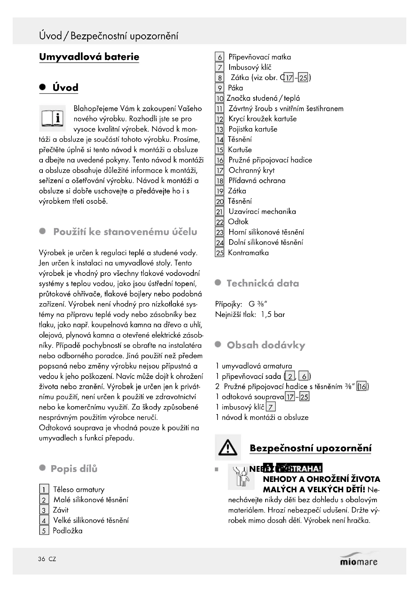 KÝM PROUDEM! Netěsnosti nebo únik vody mohou ohrozit život zása- hem elektrického proudu. Kontrolujte pečlivě těsnost spojení. Zajistěte správnou a bezpečnou instalaci elektrického připojení přístrojů. POZOR! NEBEZPEČÍ ZRANĚNÍ! Zajistěte, aby nebyly díly poškozené a správně namonto- vané. Při nesprávné montáži hrozí nebezpečí zranění. Prosíme, vezměte na vědomí, že jsou podložky a těsnění díly podléhající opotřebení a musí se čas od času vyměnit. Poškozené díly mohou ovlivnit funkci a bezpečnost. POZOR! VĚCNÉ ŠKODY! Prosíme, nechte montáž provést odborníkem. Dbejte pozor na správnou polohu všech těsnění. NEBEZPEČÍ OPAŘENÍ! Při nastavování teplé vody dbejte na přiměřenou teplotu. NEBEZPEČÍ OPAŘENÍ! Horká voda vumyvadle může způsobit opaření. Dříve než použijete odtokovou soupravu, musíte nechat vodu vychladnout POZOR! Dejte pozor na správné umístění plaketky