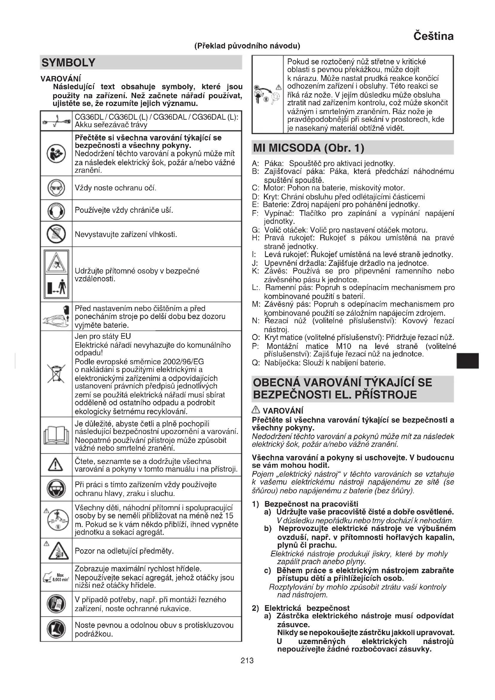 a) Zástrčka elektrického nástroje musí odpovídat zásuvce. Nikdy se nepokoušejte zástrčku jakkoli upravovat. U uzemněných elektrických nástrojů nepoužívejte žádné rozbočovací zásuvky. SYMBOLY VAROVÁNÍ Následující text obsahuje symboly, které jsou použity na zařízení. Než začnete nářadí používat, ujistěte se, že rozumíte jejich významu. CG36DL / CG36DL (L) / CG36DAL / CG36DAL (L): Akku seřezávač trávy Přečtěte si všechna varování týkající se bezpečnosti a všechny pokyny. Nedodržení těchto varování a pokynů může mít za následek elektrický šok, požár a/nebo vážné zranění. Vždy noste ochranu očí. Používejte vždy chrániče uší. Nevystavujte zařízení vlhkosti. Udržujte přítomné osoby v bezpečné vzdálenosti. Před nastavením nebo čištěním a před ponecháním stroje po delší dobu bez dozoru vyjměte baterie. Jen pro státy EU Elektrické nářadí nevyhazujte do komunálního odpadu! Podle evropské směrnice 2002/96/EG o nakládání s použitými elektrickými a elektronickými zařízeními a odpovídajících ustanovení právních předpisů jednotlivých zemí se použitá elektrická nářadí musí sbírat odděleně od ostatního odpadu a podrobit ekologicky šetrnému recyklování. Je důležité, abyste četli a plně pochopili následující bezpečnostní upozornění a varování. Neopatrné používání přístroje může způsobit vážné nebo smrtelné zranění. Čtete, seznamte se a dodržujte všechna varování a pokyny v tomto manuálu i na přístroji. Při práci s tímto zařízením vždy používejte ochranu hlavy, zraku i sluchu. Všechny děti, náhodní přítomní i spolupracující osoby by se neměli přibližovat na méně než 15 m. Pokud se k vám někdo přiblíží, ihned vypněte jednotku a sekací agregát. Pozor na odletující předměty. Max 8,000 min