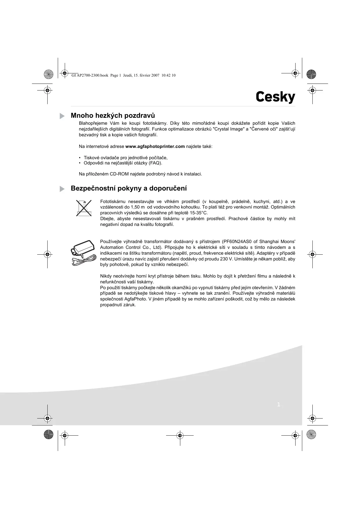 La marca CE atesta la conformidad del producto con las exigencias esenciales de la directiva 1999/5/CE del Parlamento y del Consejo Europeo relativa a los equipos terminales de telecomunicaciones, para la seguridad y la salud de los usuarios, para las perturbaciones electromagnéticas. La declaración de conformidad puede consultarse en la Web www.agfaphotoprinter.com rúbrica "soporte" o puede solicitarse en la dirección siguiente: AGFAPHOTO is used under license of Agfa-Gevaert AG AP2300-2700 are procuded for Sagem Communication and distributed or sold by Sagem Communication . e la carta Papierf antes plaatst di inserir hoja assette esta prima papierc foglio Quitar e. in de questo na casset papier vere Rimuo to. t u het r o papel voorda casset de coloca tten. sheet skasse • activar el retoque automático de la foto para su impresión, • ajustar los parámetros "Formato", "Preferencias" y "Ajustes imagen" en función de sus necesidades, • seleccionar varias fotos y seleccionar un número de ejemplares diferentes para cada foto a imprimir, • realizar un zoom en una foto e imprimirla.