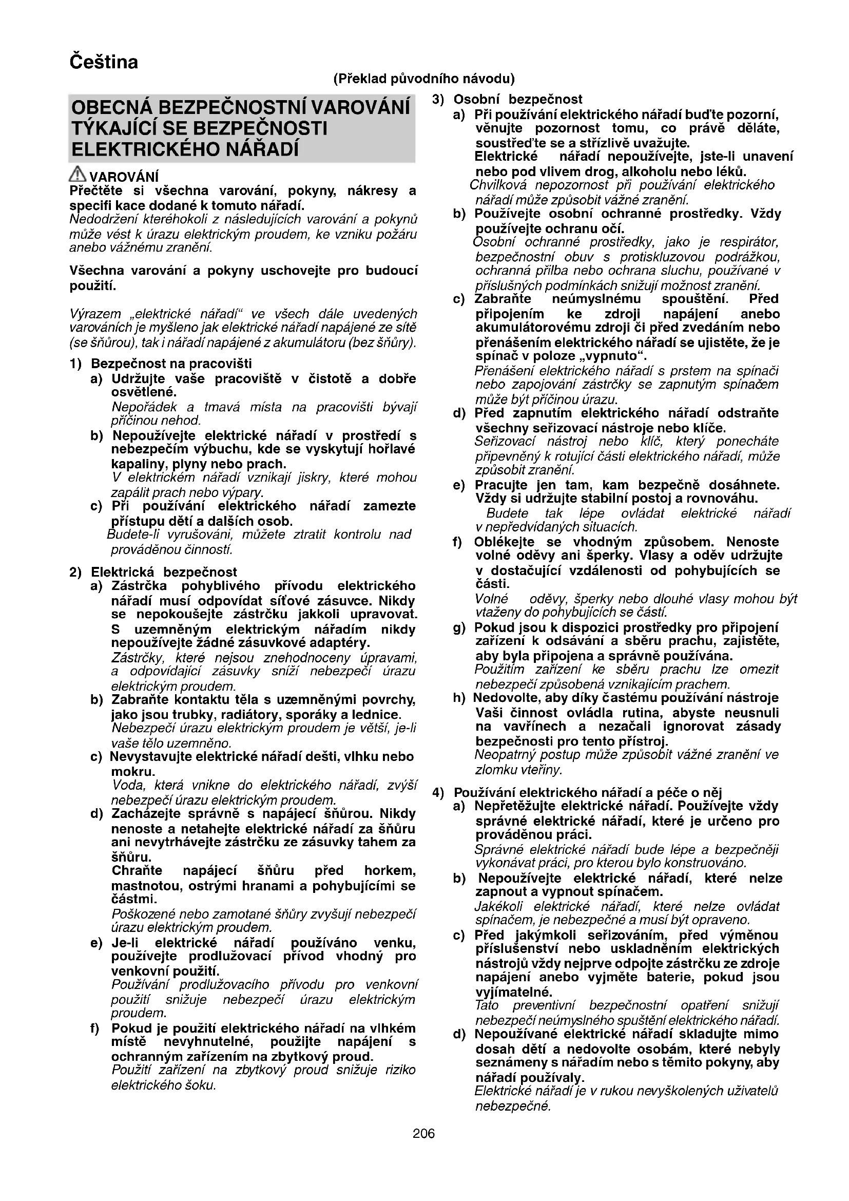 VAROVÁNÍ Přečtěte si všechna varování, pokyny, nákresy a specifi kace dodané k tomuto nářadí. Nedodržení kteréhokoli z následujících varování a pokynů může vést k úrazu elektrickým proudem, ke vzniku požáru anebo vážnému zranění. Všechna varování a pokyny uschovejte pro budoucí použití. Výrazem „elektrické nářadí“ ve všech dále uvedených varováních je myšleno jak elektrické nářadí napájené ze sítě (se šňůrou), tak i nářadí napájené z akumulátoru (bez šňůry).