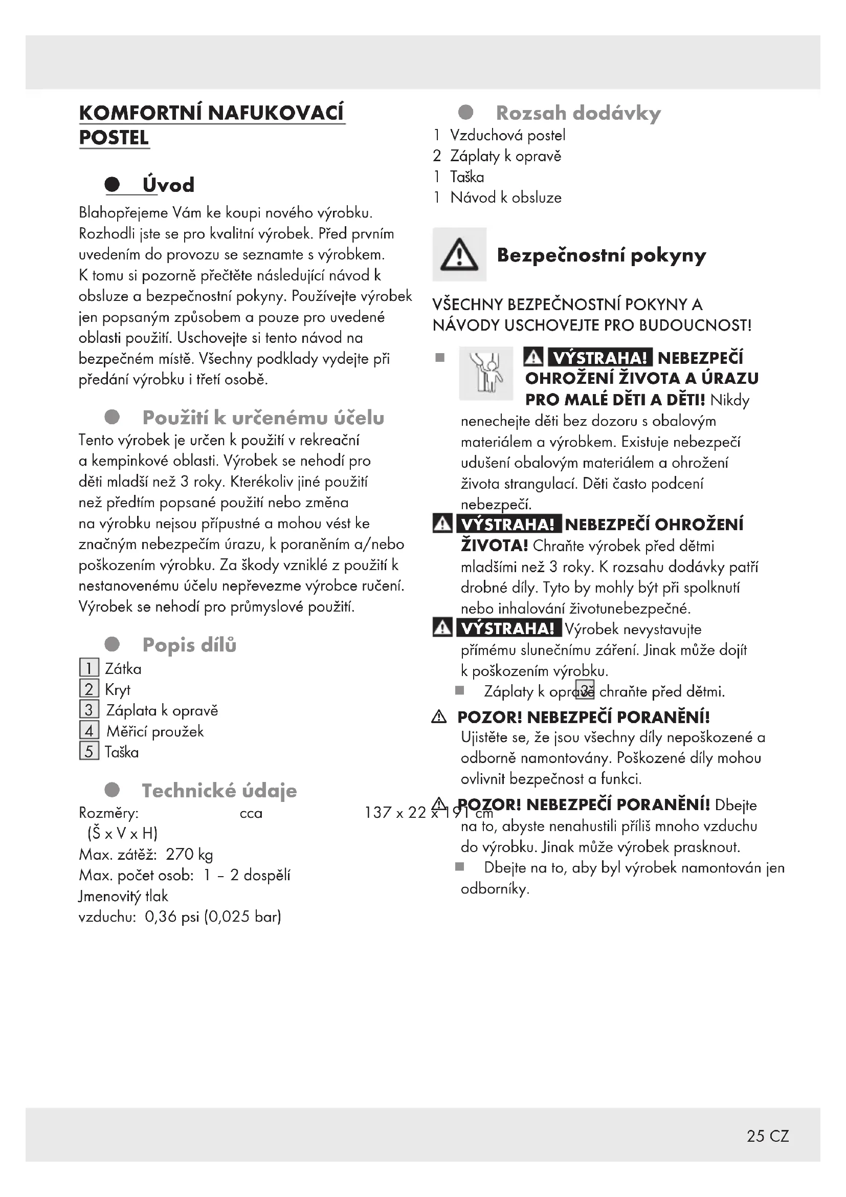 Taška Technické údaje Rozměry: cca 137 x 22 x 191 cm (Š x V x H) Max. zátěž: 270 kg Max. počet osob: 1 – 2 dospělí Jmenovitý tlak vzduchu: 0,36 psi (0,025 bar) Rozsah dodávky 1 Vzduchová postel 2 Záplaty k opravě 1 Taška 1 Návod k obsluze Bezpečnostní pokyny
