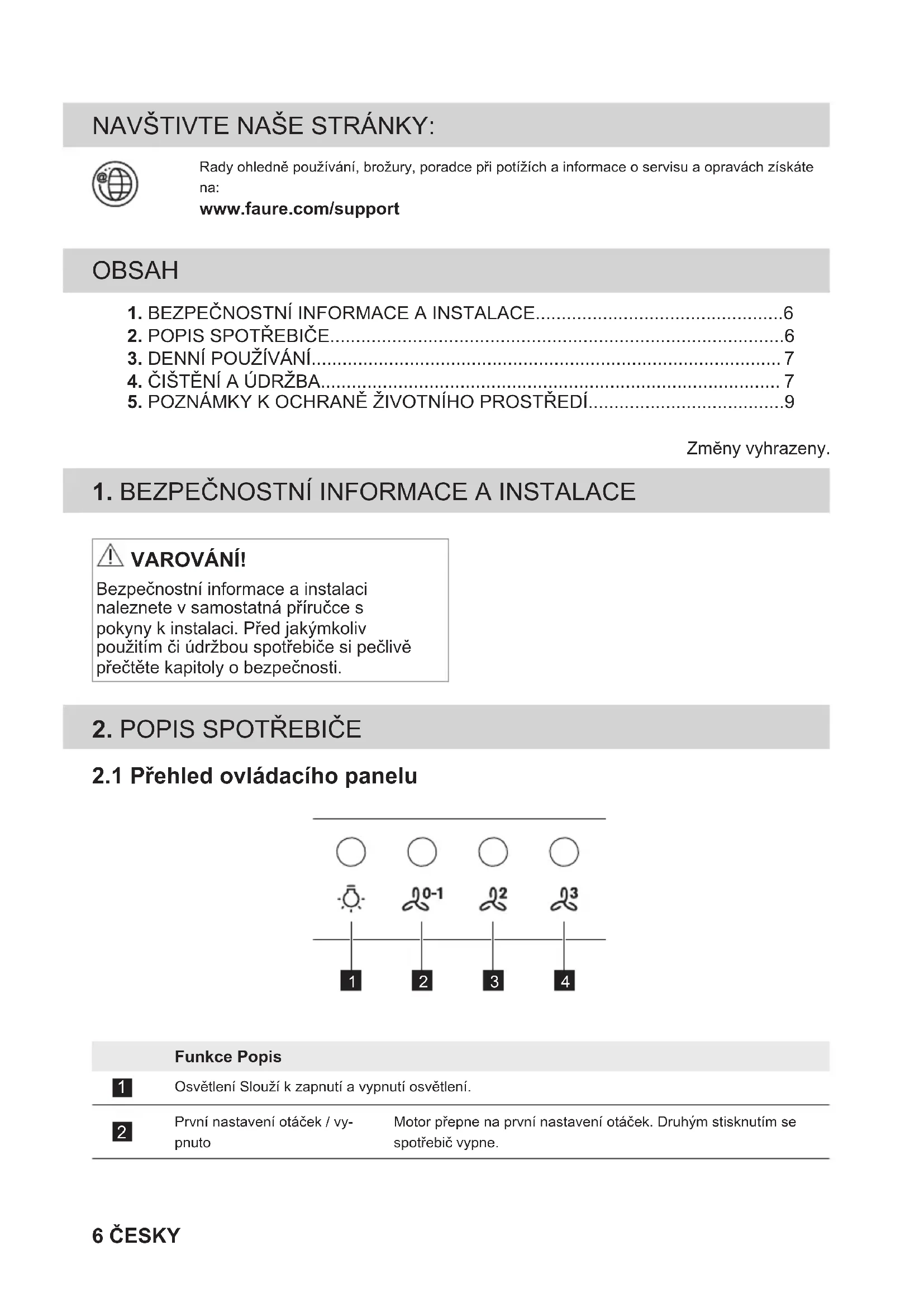 VAROVÁNÍ! Bezpečnostní informace a instalaci naleznete v samostatná příručce s pokyny k instalaci. Před jakýmkoliv použitím či údržbou spotřebiče si pečlivě přečtěte kapitoly o bezpečnosti.