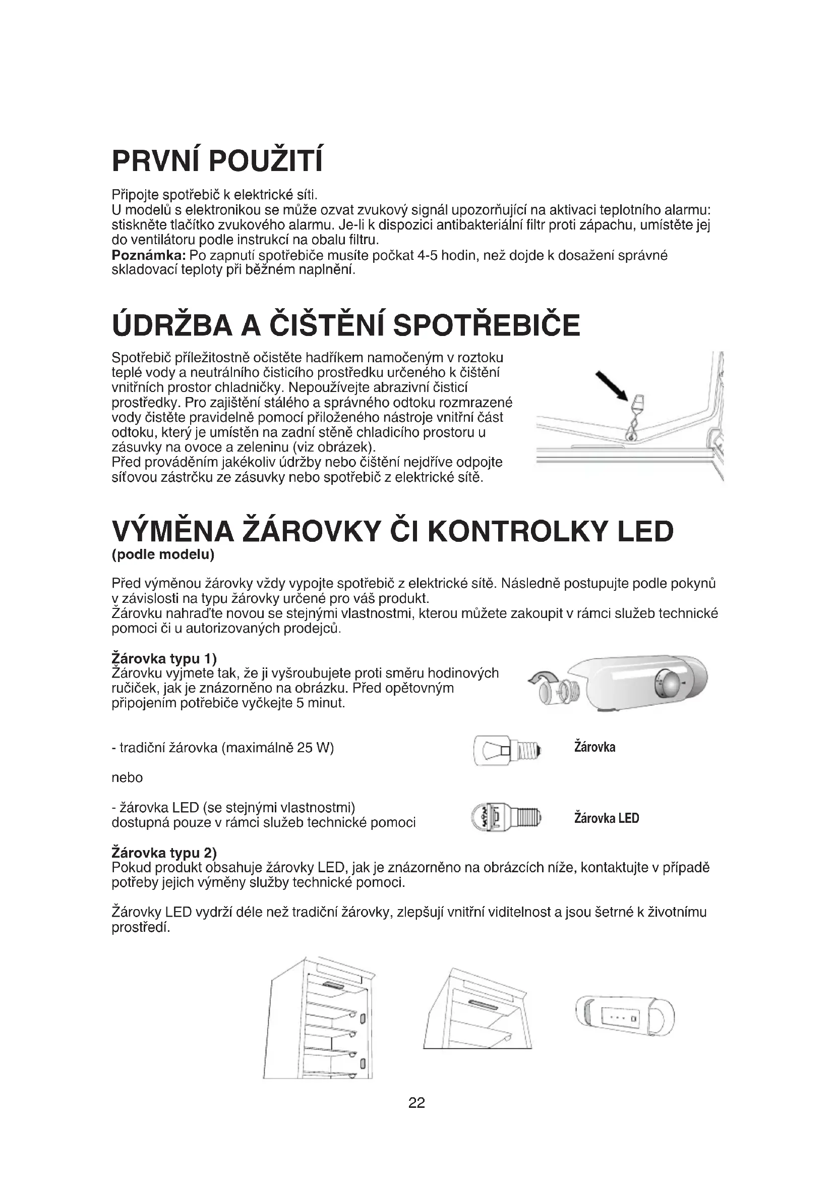 ÚDRŽBA A ČIŠTĚNÍ SPOTŘEBIČE VÝMĚNA ŽÁROVKY ČI KONTROLKY LED (podle modelu) LED- strip Dragon et2 Žárovka Žárovka LED23 Vypojte spotřebič z elektrické sítě, vyprázděte jej, (v případě potřeby) odmražte a vyčistěte. Dveře ponechte pootevřené, aby mohl jednotlivými oddíly proudit vzduch. Tím zabráníte vzniku plísní a zápachu. V PŘÍPADĚ NEPOUŽÍVÁNÍ SPOTŘEBIČE Dveře ponechte zavřené, aby jídlo zůstalo co nejdéle v chladu. Nezmražujte znova potraviny, které se částečně rozmrazily. Dojde-li k delšímu výpadku proudu, může se aktivovat alarm výpadku proudu (u výrobků s elektronikou). V PŘÍPADĚ PŘERUŠENÍ NAPÁJENÍ Chladicí oddíl slouží k uchovávání čerstvých potravin a nápojů. Odmražování chladničky probíhá zcela automaticky. O zahájení automatické fáze rozmrazování svědčí příležitostný výskyt kapek vody na vnitřní zadní stěně oddílu. Rozmrazená voda stéká do odtoku a shromažďuje se v nádobě, odkud se vypařuje. V závislosti na modelu může být výrobek vybaven speciálním prostorem s nulovou teplotou, která je ideální pro skladování čerstvého masa a ryb. Varování: příslušenství chladničky neumývejte v myčce na nádobí. Poznámka: teplota v místnosti, častost otevírání dveří a umístění spotřebiče mohou ovlivnit teplotu uvnitř obou oddílů. Proto teplotu nastavujte v závislosti na těchto fatorech. Poznámka: ve velmi vlhkém prostředí může dojít k orosení v chladicím prostoru, zejména na skleněných poličkách. V takovémto případě se doporučuje uzavřít nádoby s tekutinami (např. hrnec s vývarem), zabalit jídlo s vysokým obsahem vody (např. zeleninu) a zapnout ventilátor, pokud je k dispozici. Vysouvání přihrádky na ovoce a zeleninu (podle modelu) Přihrádku vysuňte tak daleko, jak to půjde, pak ji nadzvedněte a vyjměte. Pro snazší vyjmutí přihrádky na ovoce a zeleninu může být nutné vyprázdnit (a případně vyjmout) dvě spodní police na dveřích a až pak pokračovat ve vysouvání přihrádky. Ventilátor a antibakteriální filtr proti zápachu (podle modelu) Ventilátor umožňuje rovnoměrné rozložení teploty uvnitř oddílů, čímž zajišťuje lepší uchovávání potravin a snížení nadměrné vlhkosti. Nezakrývejte ventilační oblast. Ventilátor je možné ručně zapnut či vypnout (viz Stručný návod). Pokud je zapnutý, funguje v případě potřeby automaticky.