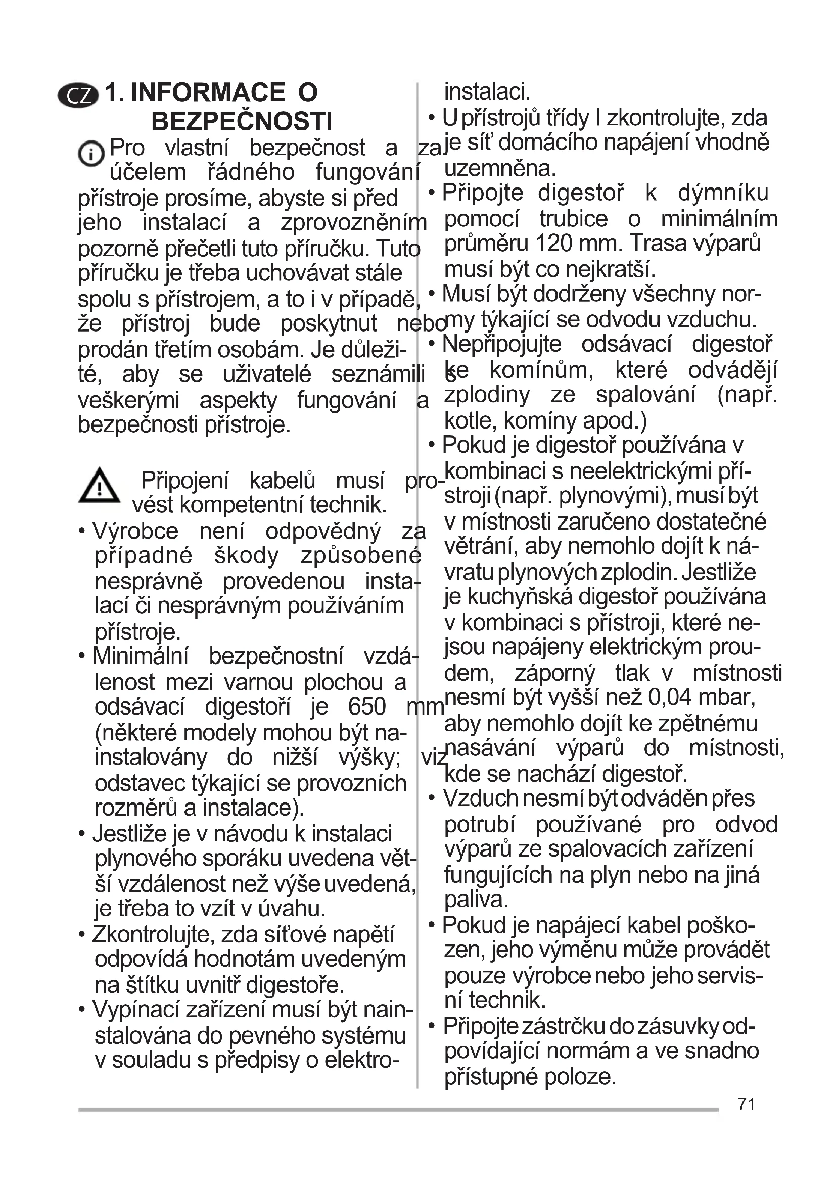 - Nepřipojujte odsávací digestoř ke komínům, které odvádějí zplodiny ze spalování (např. kotle,komínyapod.)