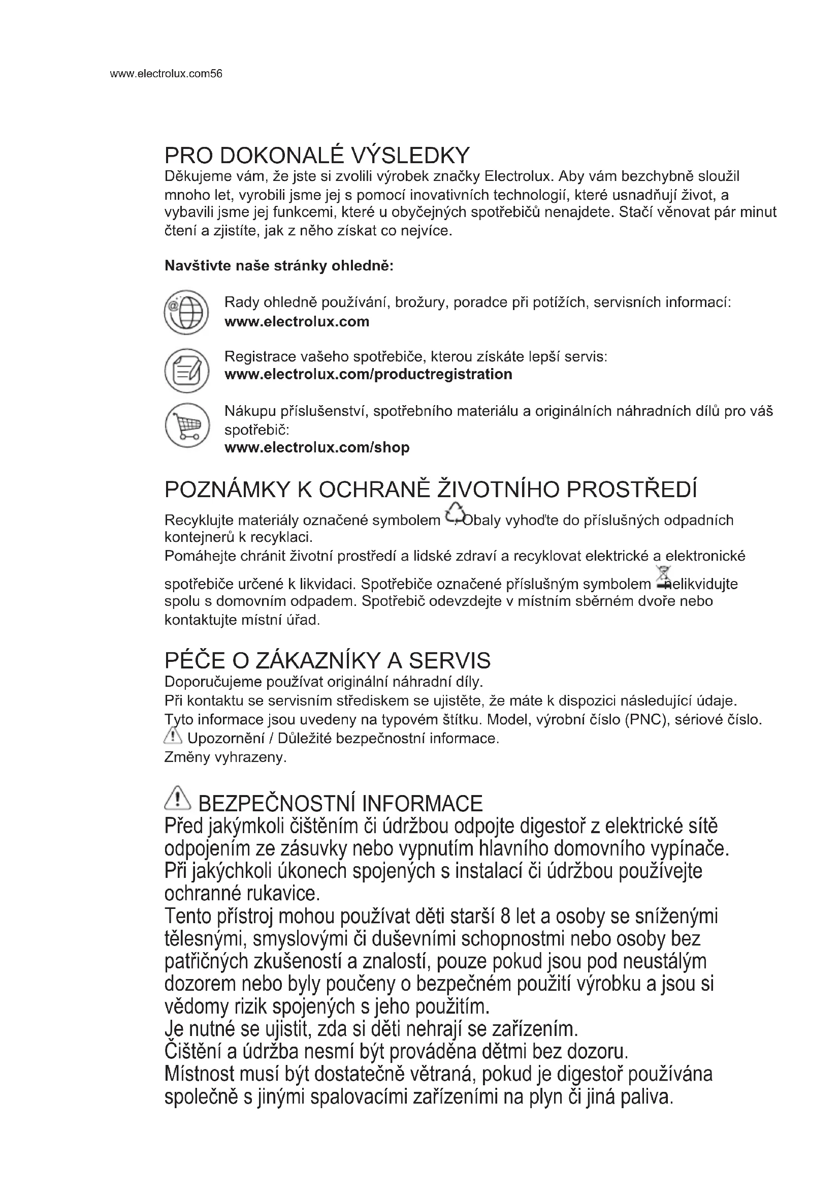 Děkujeme vám, že jste si zvolili výrobek značky Electrolux. Aby vám bezchybně sloužil mnoho let, vyrobili jsme jej s pomocí inovativních technologií, které usnadňují život, a vybavili jsme jej funkcemi, které u obyčejných spotřebičů nenajdete. Stačí věnovat pár minut čtení a zjistíte, jak z něho získat co nejvíce. Navštivte naše stránky ohledně: Rady ohledně používání, brožury, poradce při potížích, servisních informací: www.electrolux.com Registrace vašeho spotřebiče, kterou získáte lepší servis: www.electrolux.com/productregistration Nákupu příslušenství, spotřebního materiálu a originálních náhradních dílů pro váš spotřebič: www.electrolux.com/shop POZNÁMKY K OCHRANĚ ŽIVOTNÍHO PROSTŘEDÍ Recyklujte materiály označené symbolem . Obaly vyhoďte do příslušných odpadních kontejnerů k recyklaci. Pomáhejte chránit životní prostředí a lidské zdraví a recyklovat elektrické a elektronické spotřebiče určené k likvidaci. Spotřebiče označené příslušným symbolem nelikvidujte spolu s domovním odpadem. Spotřebič odevzdejte v místním sběrném dvoře nebo kontaktujte místní úřad. PÉČE O ZÁKAZNÍKY A SERVIS Doporučujeme používat originální náhradní díly. Při kontaktu se servisním střediskem se ujistěte, že máte k dispozici následující údaje. Tyto informace jsou uvedeny na typovém štítku. Model, výrobní číslo (PNC), sériové číslo. Upozornění / Důležité bezpečnostní informace. Změny vyhrazeny.