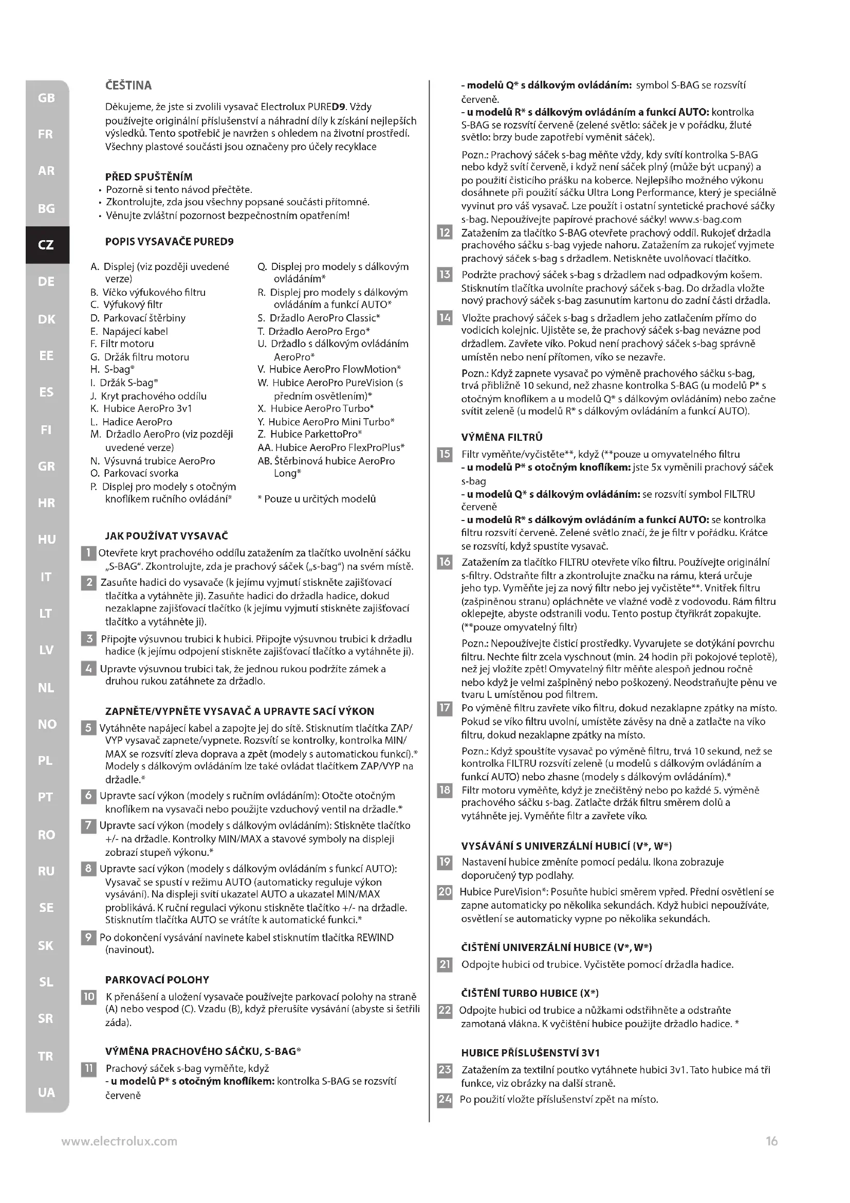 15 Filtr vyměňte/vyčistěte**, když (**pouze u omyvatelného ltru - u modelů P* s otočným knoíkem: jste 5x vyměnili prachový sáček s-bag - u modelů Q* s dálkovým ovládáním: se rozsvítí symbol FILTRU červeně - u modelů R* s dálkovým ovládáním a funkcí AUTO: se kontrolka ltru rozsvítí červeně. Zelené světlo značí, že je ltr v pořádku. Krátce se rozsvítí, když spustíte vysavač. 16 Zatažením za tlačítko FILTRU otevřete víko ltru. Používejte originální s-ltry. Odstraňte ltr a zkontrolujte značku na rámu, která určuje jeho typ. Vyměňte jej za nový ltr nebo jej vyčistěte**. Vnitřek ltru (zašpiněnou stranu) opláchněte ve vlažné vodě z vodovodu. Rám ltru oklepejte, abyste odstranili vodu. Tento postup čtyřikrát zopakujte. (**pouze omyvatelný ltr) Pozn.: Nepoužívejte čisticí prostředky. Vyvarujete se dotýkání povrchu ltru. Nechte ltr zcela vyschnout (min. 24 hodin při pokojové teplotě), než jej vložíte zpět! Omyvatelný ltr měňte alespoň jednou ročně nebo když je velmi zašpiněný nebo poškozený. Neodstraňujte pěnu ve tvaru L umístěnou pod ltrem. 17 Po výměně ltru zavřete víko ltru, dokud nezaklapne zpátky na místo. Pokud se víko ltru uvolní, umístěte závěsy na dně a zatlačte na víko ltru, dokud nezaklapne zpátky na místo. Pozn.: Když spouštíte vysavač po výměně ltru, trvá 10 sekund, než se kontrolka FILTRU rozsvítí zeleně (u modelů s dálkovým ovládáním a funkcí AUTO) nebo zhasne (modely s dálkovým ovládáním).* 18 Filtr motoru vyměňte, když je znečištěný nebo po každé 5. výměně prachového sáčku s-bag. Zatlačte držák ltru směrem dolů a vytáhněte jej. Vyměňte ltr a zavřete víko. VYSÁVÁNÍ S UNIVERZÁLNÍ HUBICÍ V*, W* 19 Nastavení hubice změníte pomocí pedálu. Ikona zobrazuje doporučený typ podlahy. 20 Hubice PureVision*: Posuňte hubici směrem vpřed. Přední osvětlení se zapne automaticky po několika sekundách. Když hubici nepoužíváte, osvětlení se automaticky vypne po několika sekundách. ČIŠTĚNÍ UNIVERZÁLNÍ HUBICE V*, W* 21 Odpojte hubici od trubice. Vyčistěte pomocí držadla hadice.