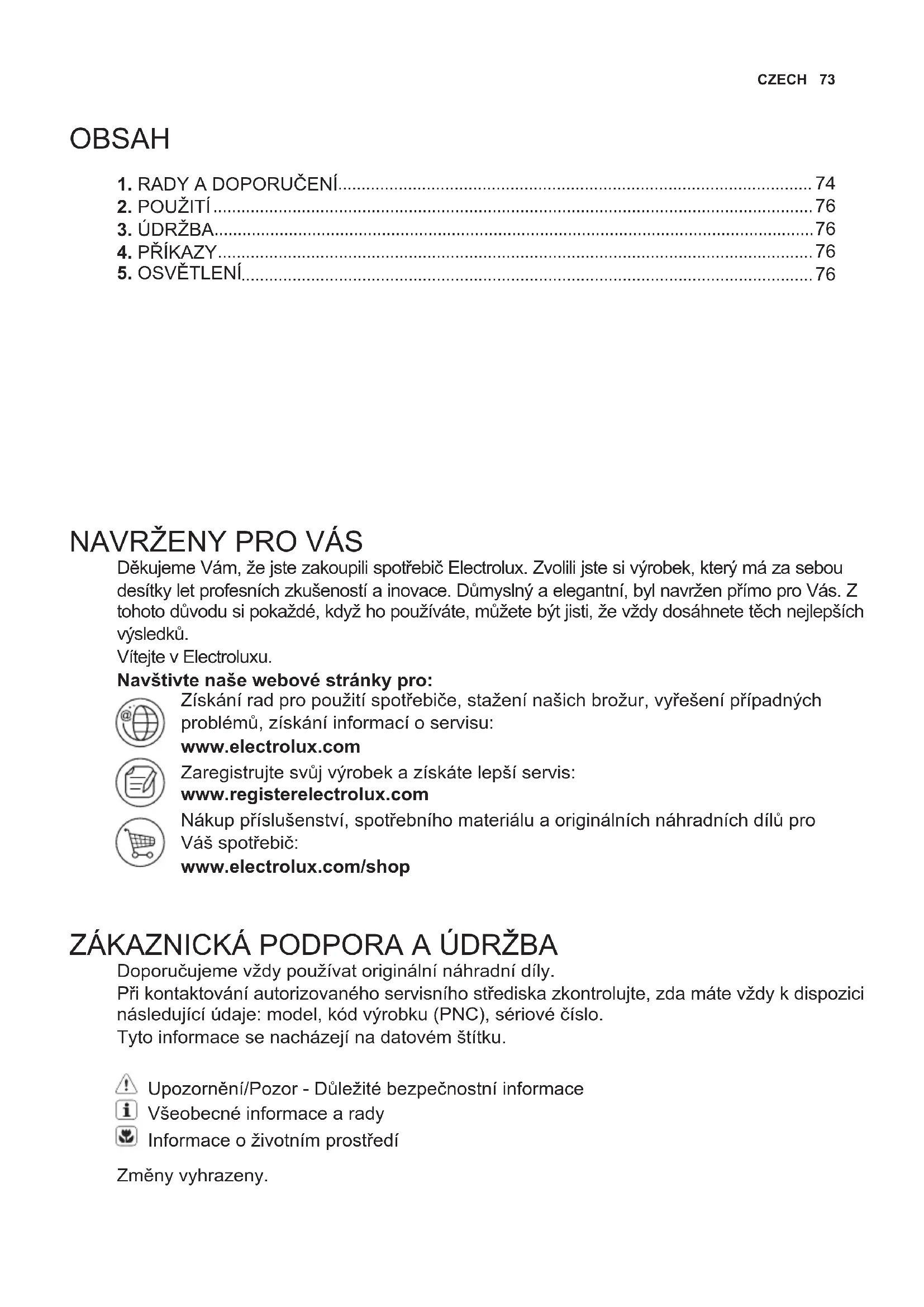 Děkujeme Vám, že jste zakoupili spotřebič Electrolux. Zvolili jste si výrobek, který má za sebou desítky let profesních zkušeností a inovace. Důmyslný a elegantní, byl navržen přímo pro Vás. Z tohoto důvodu si pokaždé, když ho používáte, můžete být jisti, že vždy dosáhnete těch nejlepších výsledků. Vítejte v Electroluxu. Navštivte naše webové stránky pro: Získání rad pro použití spotřebiče, stažení našich brožur, vyřešení případných problémů, získání informací o servisu: www.electrolux.com Zaregistrujte svůj výrobek a získáte lepší servis: www.registerelectrolux.com Nákup příslušenství, spotřebního materiálu a originálních náhradních dílů pro Váš spotřebič: www.electrolux.com/shop