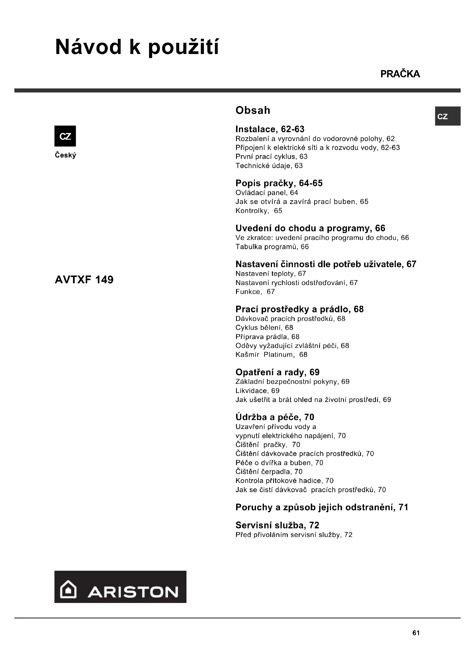 NÁVOD K OBSLUZE AVTXF 149 (EU) HOTPOINT ARISTON