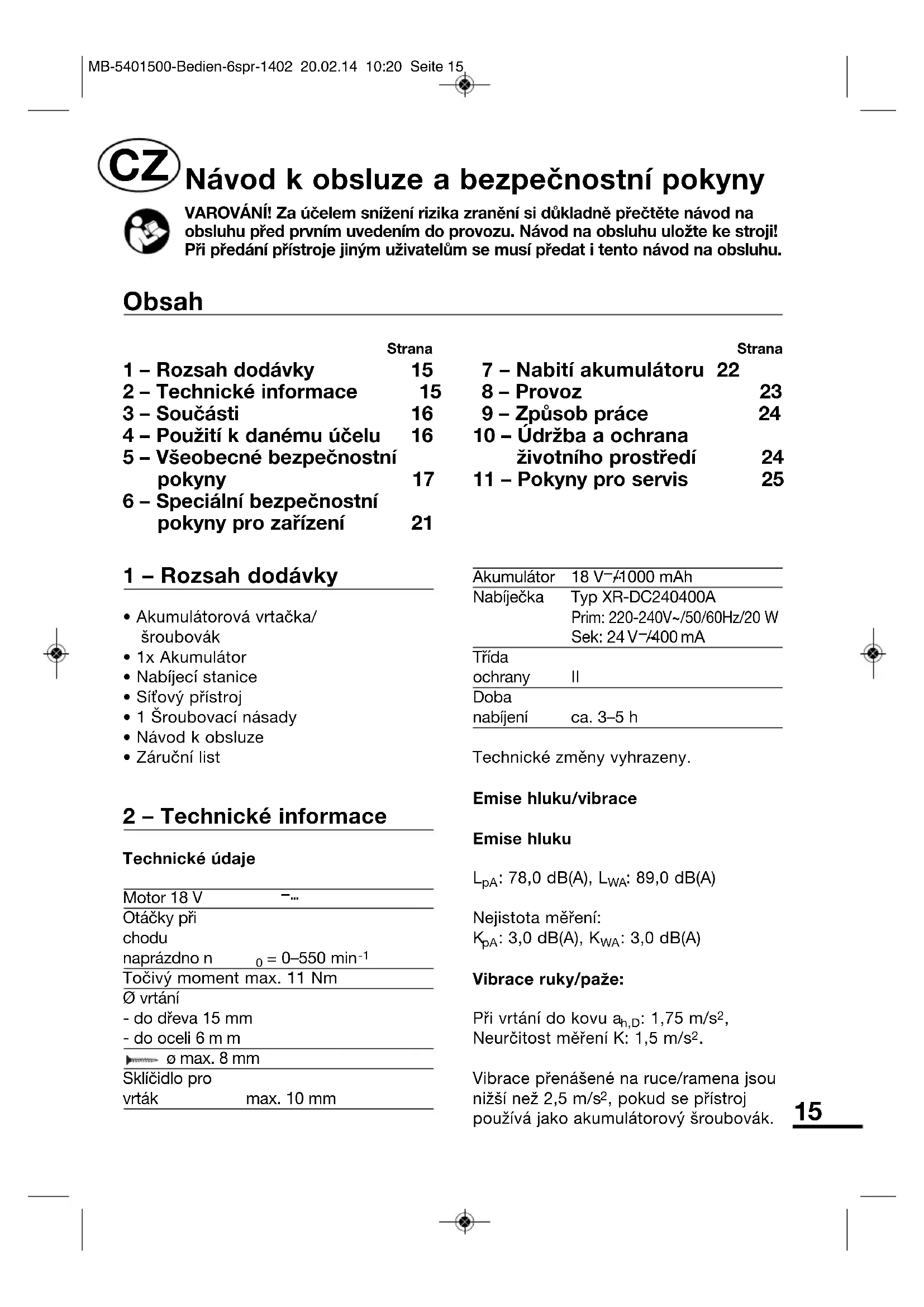 Vibrace přenášené na ruce/ramena jsounižší než 2,5 m/s , pokud se přístrojpoužívá jako akumulátorový šroubovák.Strana 1 – Rozsah dodávky 15 2 – Technické informace 15 3 – Součásti 16 4 – Použití k danému účelu 16 5 – Všeobecné bezpečnostní pokyny 17 6 – Speciální bezpečnostní pokyny pro zařízení 21 Strana 7 – Nabití akumulátoru 22 8 – Provoz 23 9 – Způsob práce 24 10 – Údržba a ochrana životního prostředí 24 11 – Pokyny pro servis 25 Obsah Návod k obsluze a bezpečnostní pokyny VAROVÁNÍ! Za účelem snížení rizika zranění si důkladně přečtěte návod naobsluhu před prvním uvedením do provozu. Návod na obsluhu uložte ke stroji!Při předání přístroje jiným uživatelům se musí předat i tento návod na obsluhu.